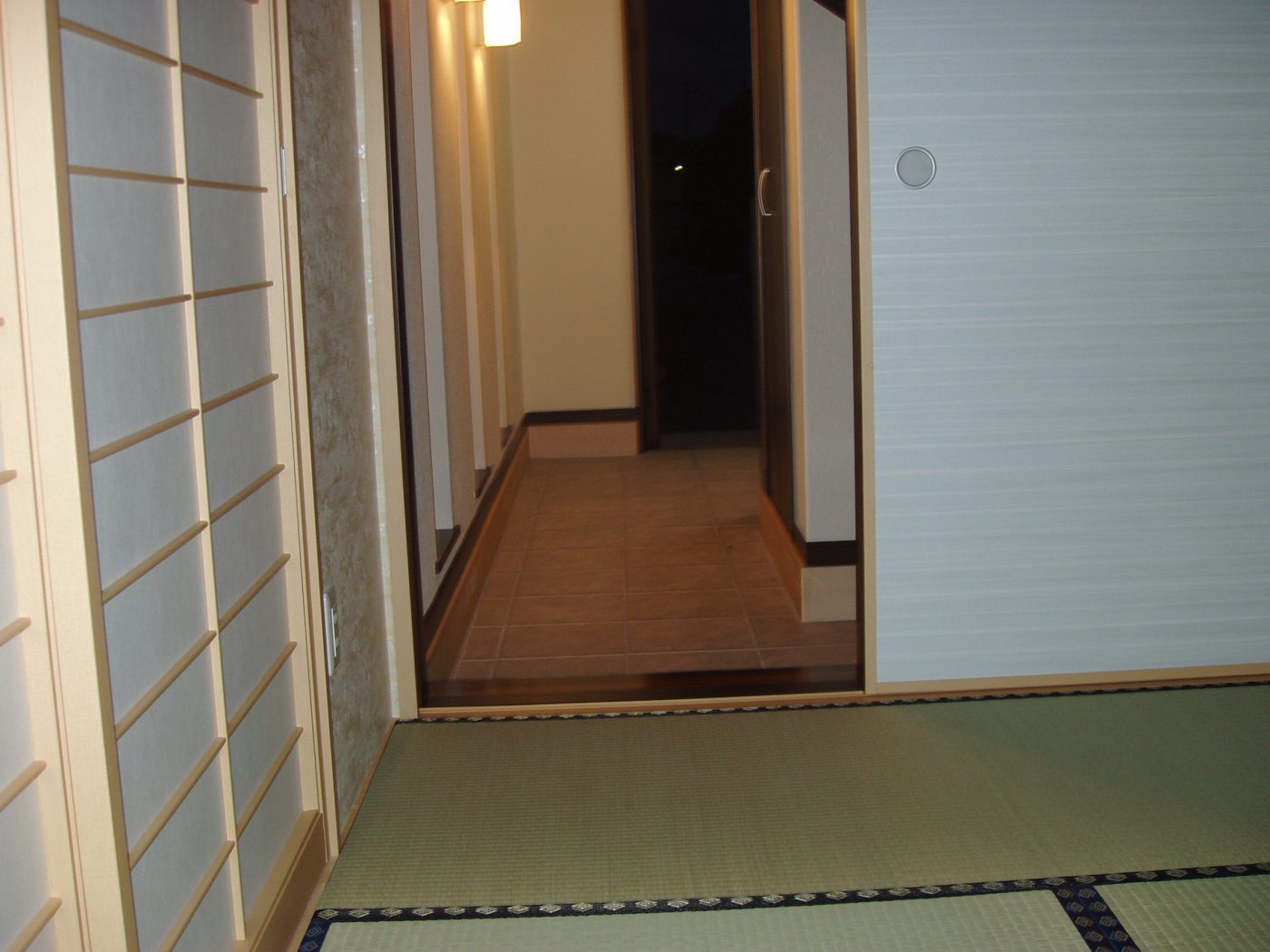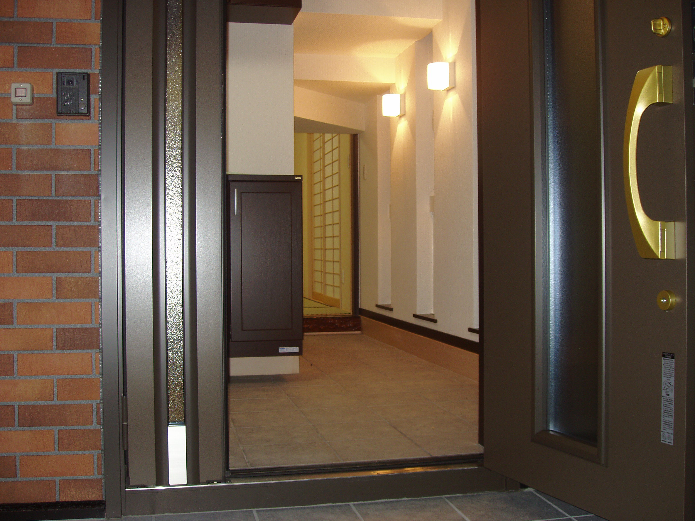 広くとった玄関はペットスペースも兼ね玄関から直接和室へ向かう動線を確保。 アクセントに3連ガラスブロック窓。
