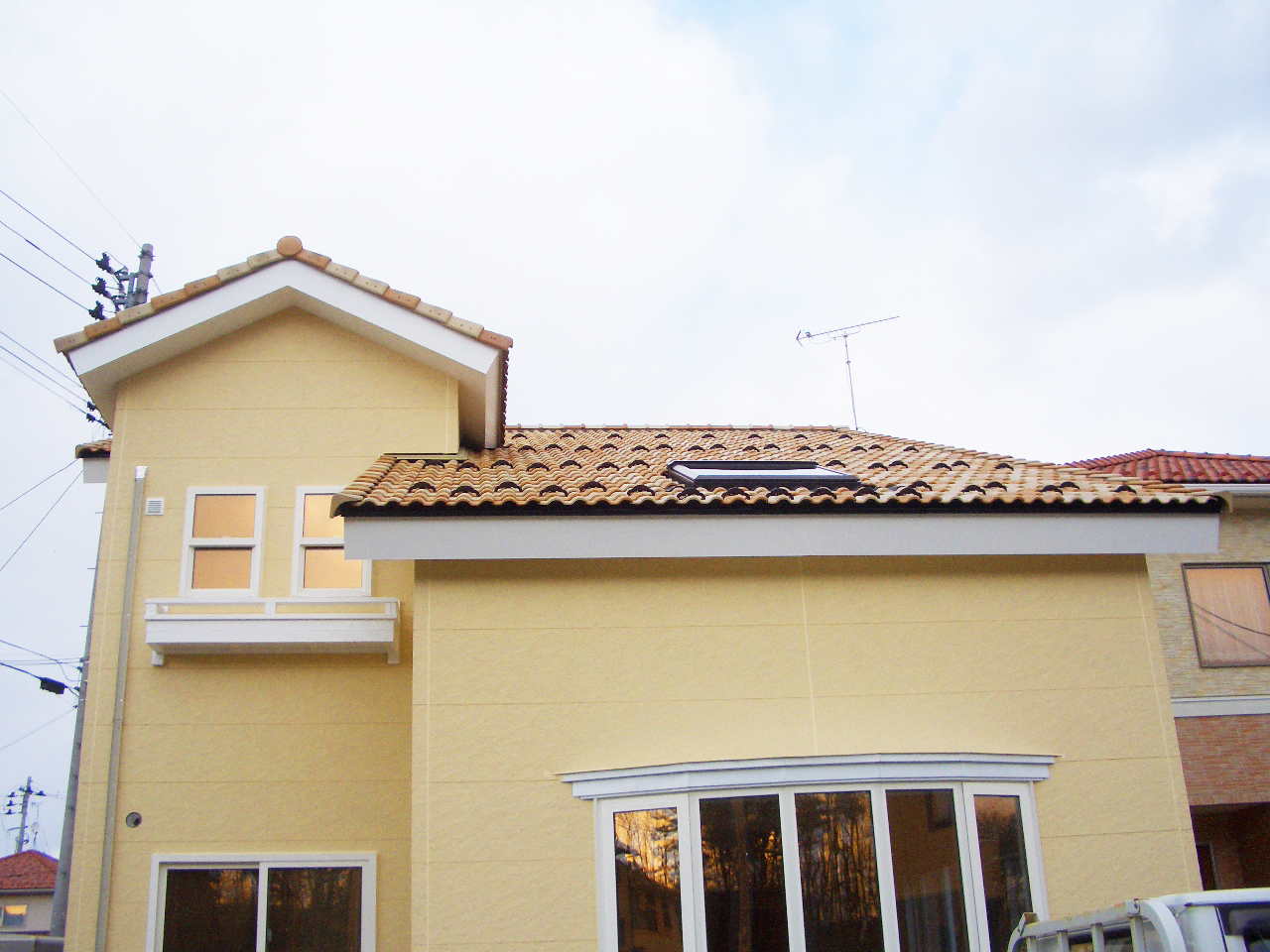 落着いた配色の洋瓦。 天窓と弓型出窓を設えたリビングはプライバシ―重視型。
