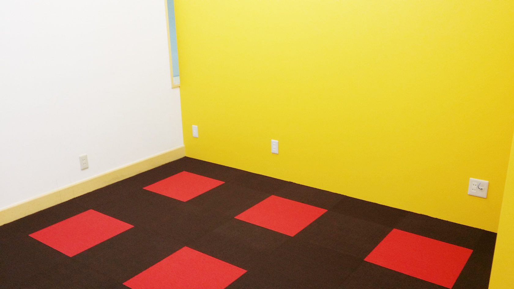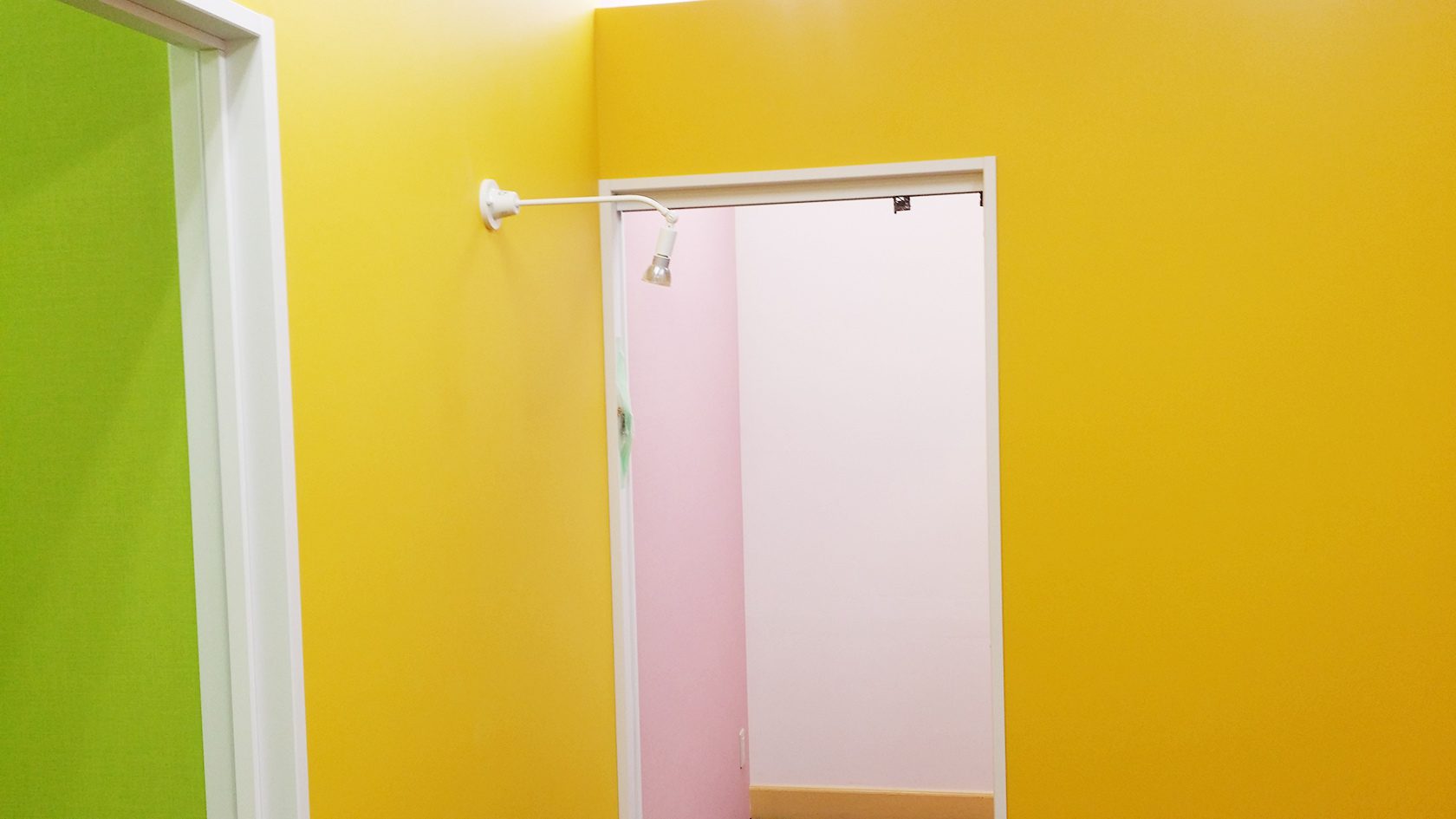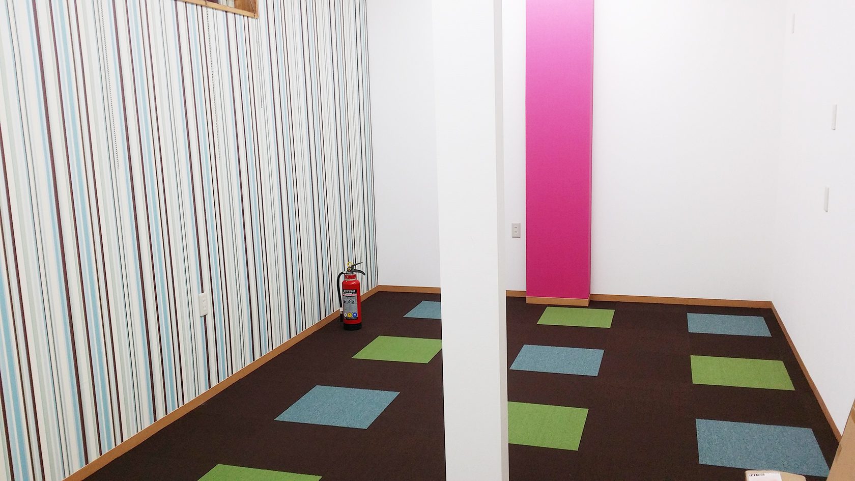 骨組組は、軽量鉄骨。空間の繋がりと冷暖房の効率を向上させる為、間仕切り壁は天井部分を開放。 建具はアンダーカットとする。電気配線は、動力以外全て新規で引き直し電圧を確認する。 最近の学習塾はとてもカラフルになったのですね。