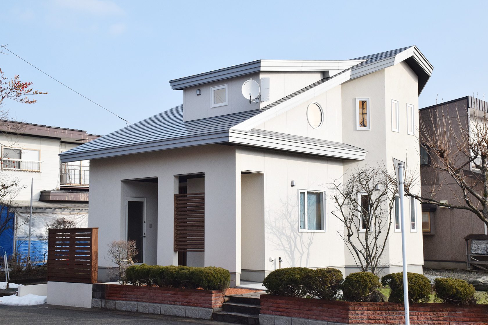 ドーマーから流れる妻下のラインとその上部に入れる丸窓。 本設計まで平屋でしたが急遽2階建てに変更した思入れある作品です。