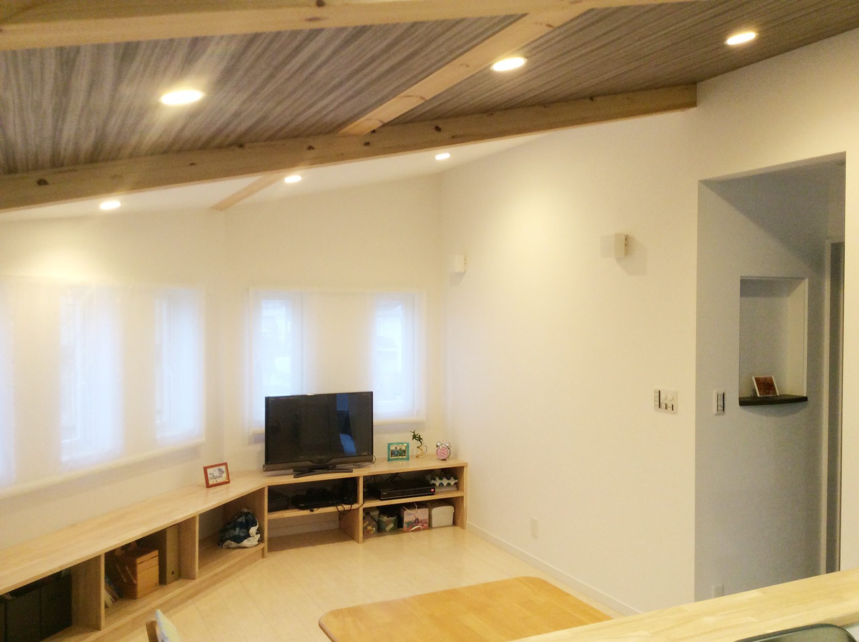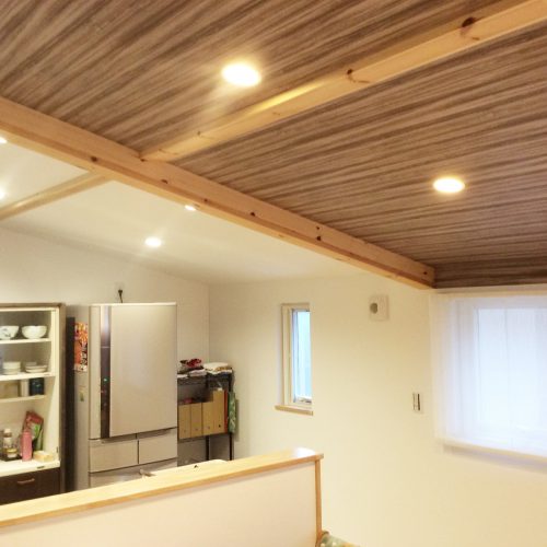 勾配天井はお決まりのパターンですが、梁に木目。