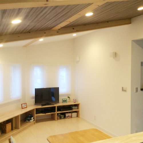 吹抜を予定していた2階にLDKを配置。 八角形のリビングは小物収納満載。