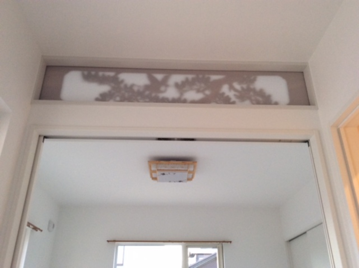 建替え前に使われていた欄間を洗浄リペア。乳白ガラスに閉じ全体のバランスを調整。リビングから見える欄間は圧巻の存在感と風格を表しています。