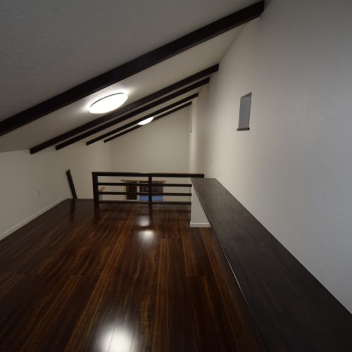9畳の洋室に付随した12畳のロフトは、隠れた作業スペース。塗料を使ってもいいように換気に配慮。活用方法は無限大。1階の雰囲気とは違いコントラストを強めにし壁と床にメリハリをつけることでより一層ロフトスペースを引き立たせています。