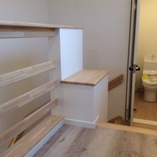 1階は叔母様の専用トイレになっている為、1階と2階の間にトイレ専用スキップフロアを設置。階段は17段に設定しているので、といれまでもゆっくりのぼれます。