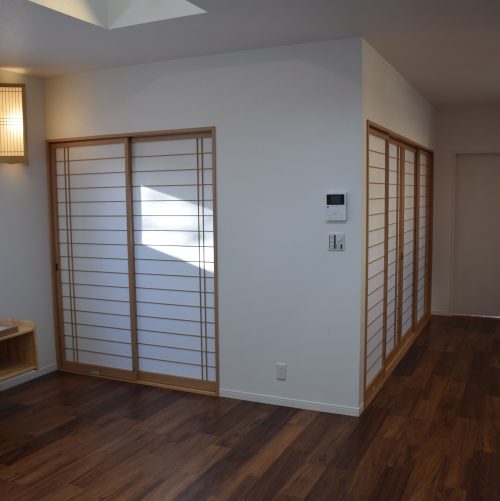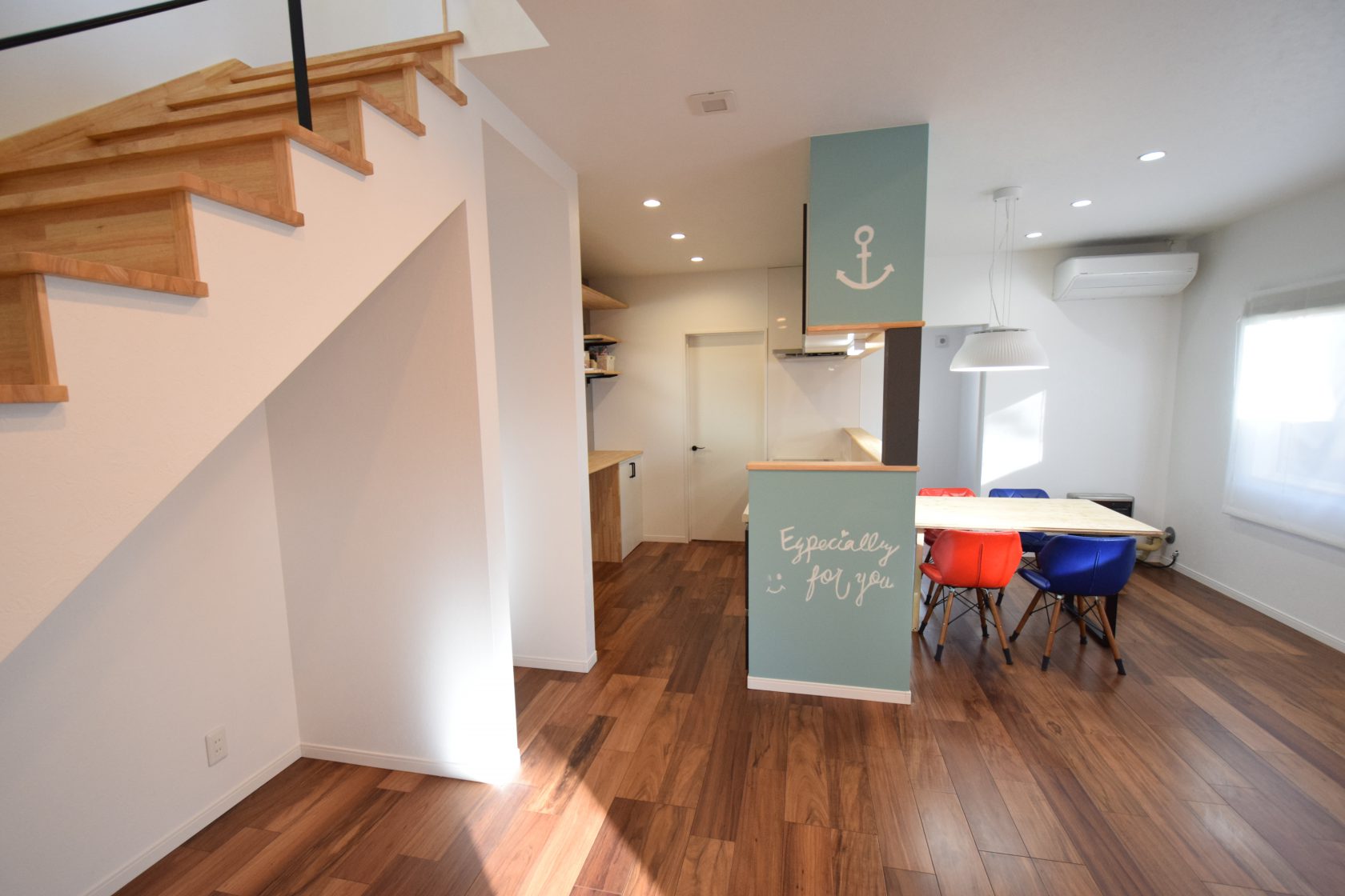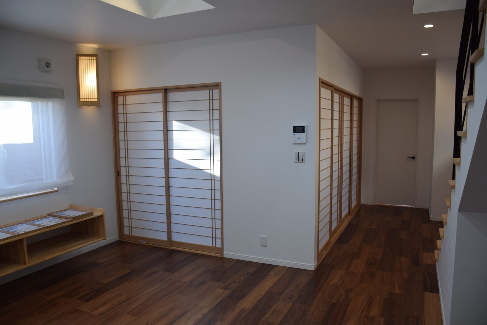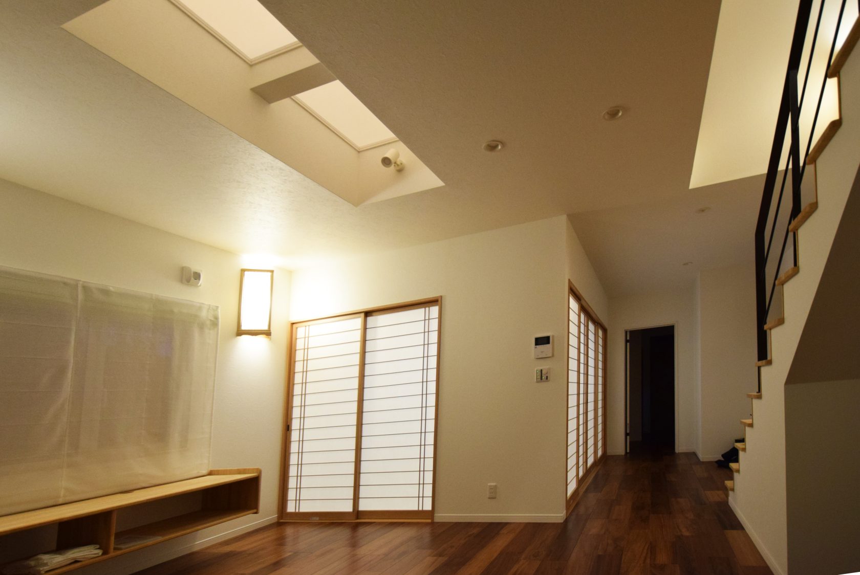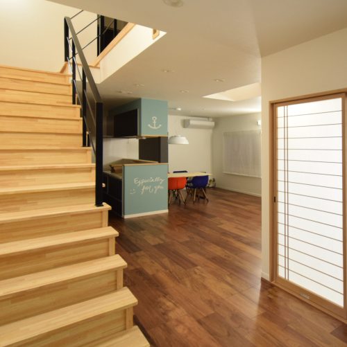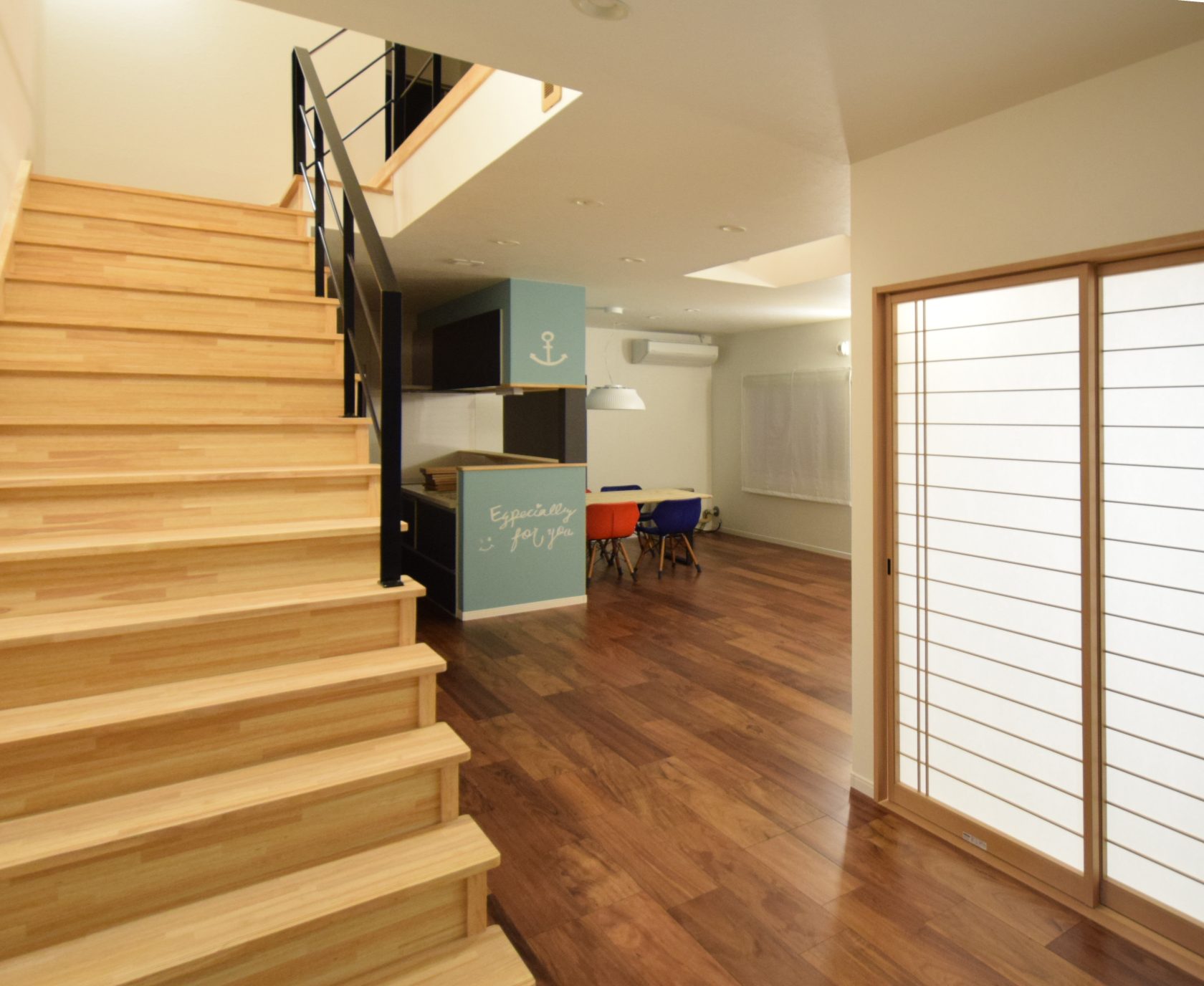 2世帯で暮らす奥様と娘様の意見を融合した結果、和風とカフェ風が融合する狭小住宅の完成です。奥様のご要望にお応えして、リビングから見える場所に和室を配置。キッチンは落書き出来る素材を使用し、人が集まるLDKの天井には強化ガラスを設置し隣地の公園から木漏れ日がリビングへ。思い出の行灯を活かした和と洋が織り成す空間が出来上がりました。