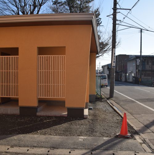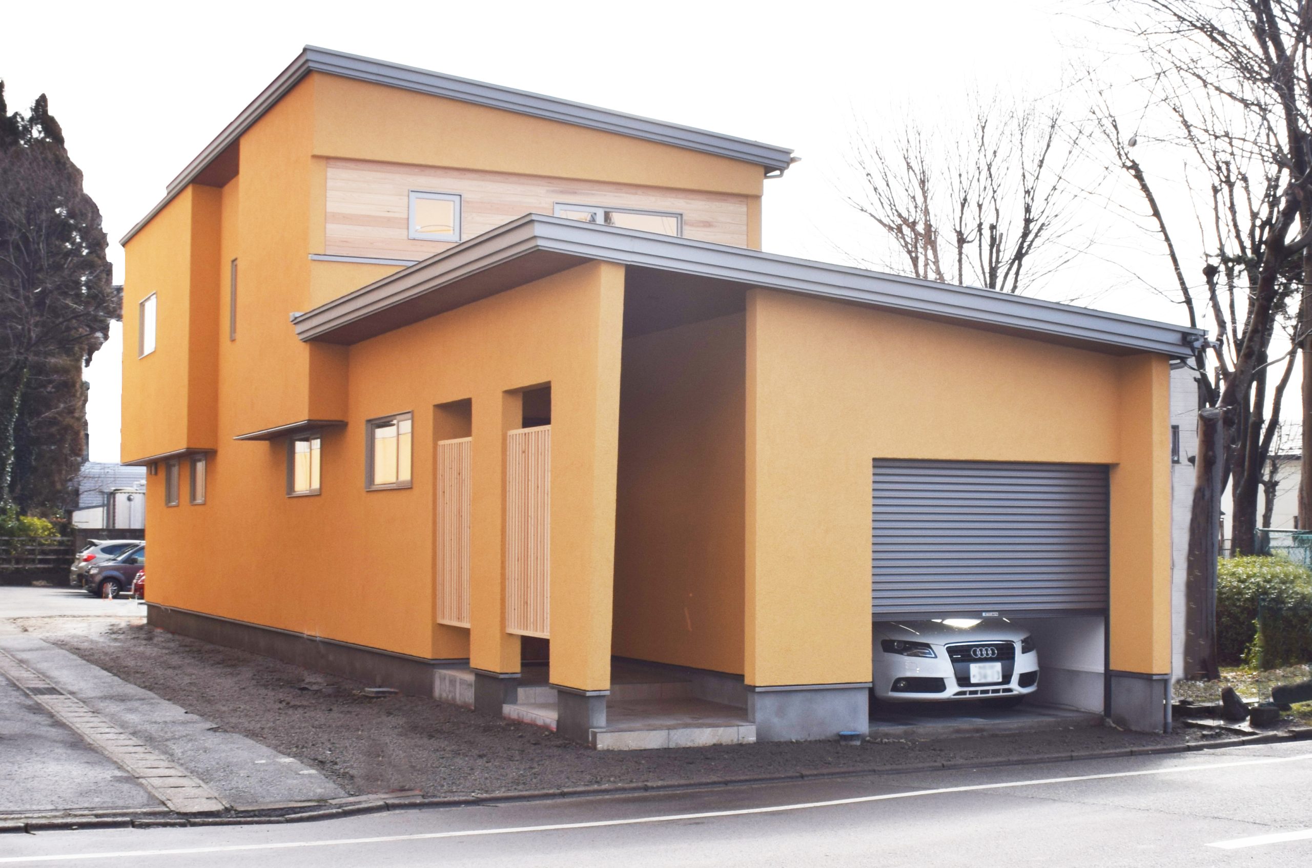 玄関アプローチを長くとり通行人から中が見えない様に配慮。金運がアップしそうな左官仕上げの外壁は施主様からのリクエスト。