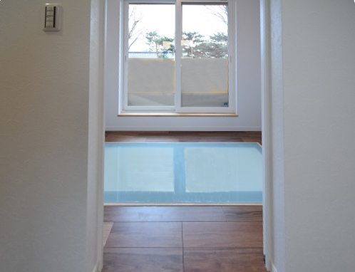 2階サンルームの床を強化ガラスとし、日中は1階リビングへ木漏れ日が差し込むように設計。