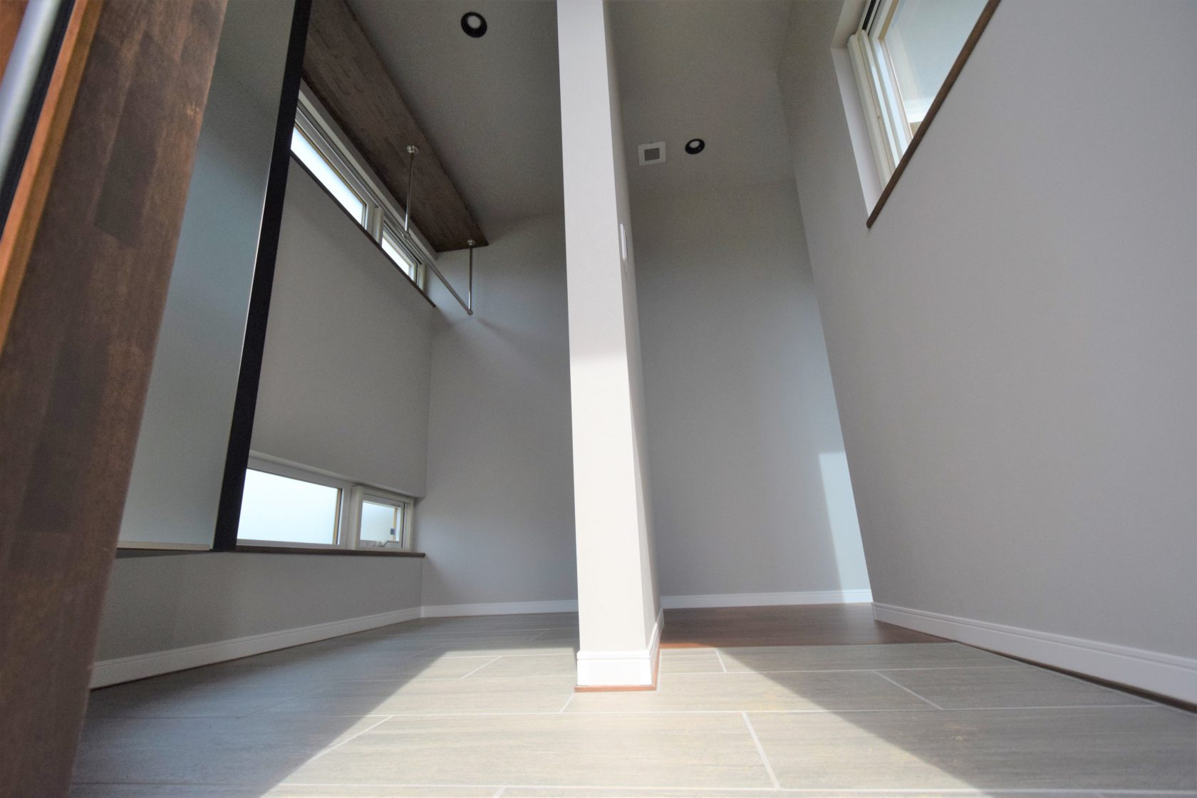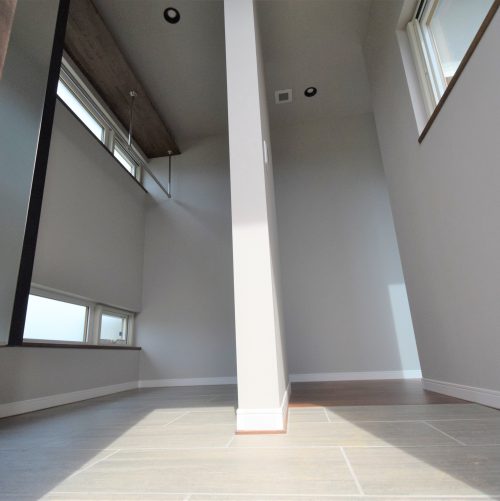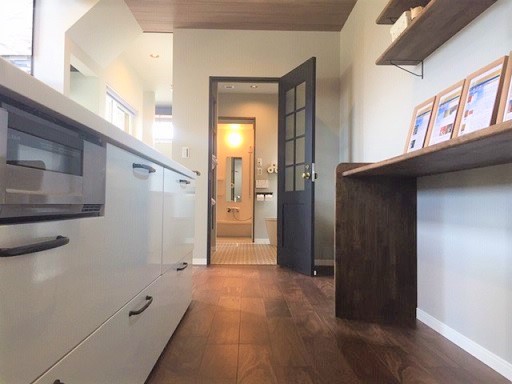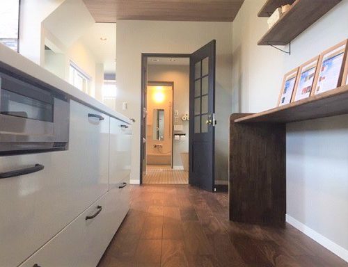 少ないご要望に水周り動線の最短化とありましたので、家事の無駄な動きを減らすためキッチン、ランドリー、洗濯物を干す場所をなるべく直線状に配置して、移動時間を短く、動きやすい水周り動線を確保。