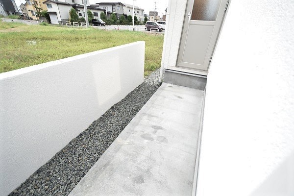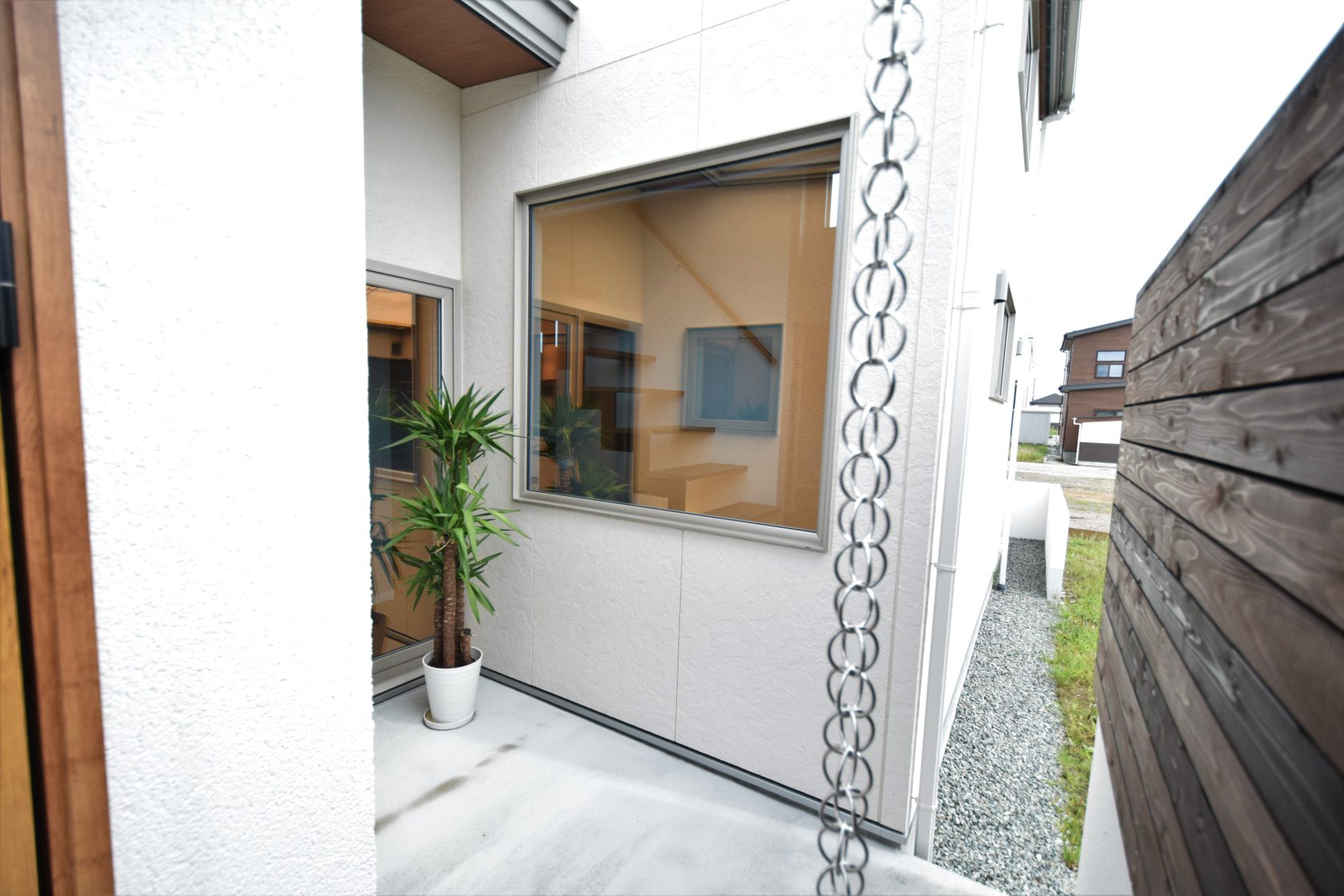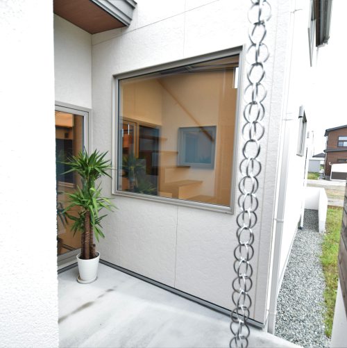 隣地からウットルーバーで目隠しされているハーフテラスはペットとの憩いの場。自然の光や風をたっぷり亨受できる開放感のある空間に愛犬が自然を満喫できるドックテラスを設置。掃除などメンテナンス性にも配慮された空間は交通量の多い場所でも安心して愛犬との時間を過ごせます。玄関先の雨樋には和風建築に利用される鎖樋を設置し雨の日でも景観を楽しめる設え。