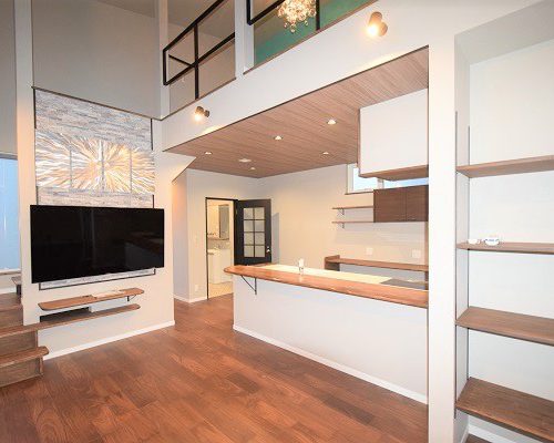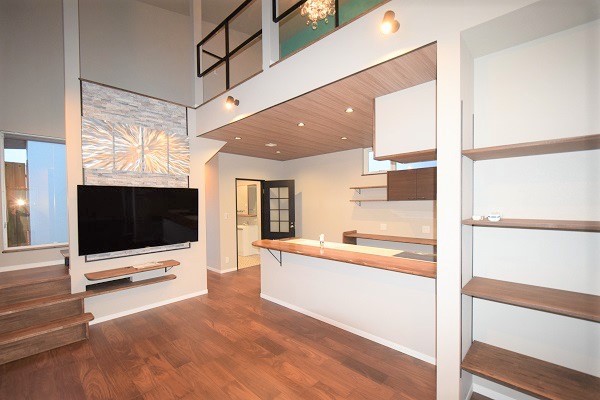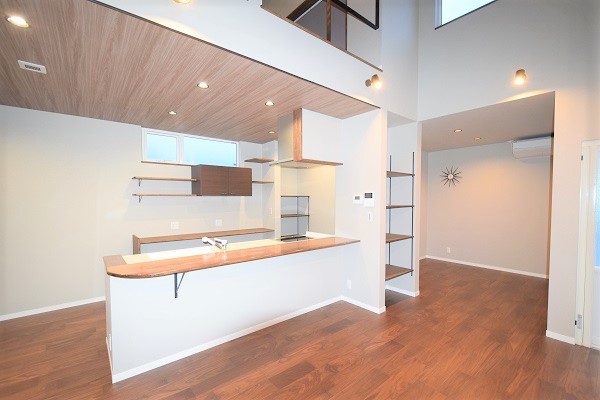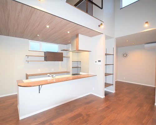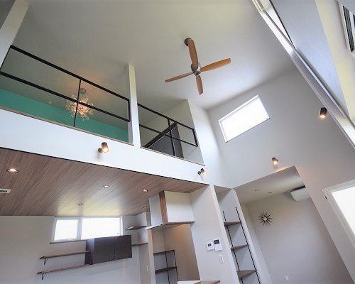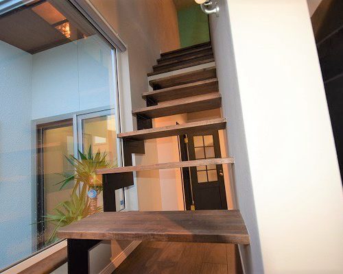 中に入るとシンプルとは逆転し、大きな窓からみえる内部の稲妻階段や解放感溢れたハーフテラスを設置。平屋特有の高い天井は8mとし、開放的な天井の一部にロフト形状のオープンな洋室を併設。北欧的でシンプルなデザインにまとめた内観はアクセントに派手目なアイテムを使用。ウォールナットの床材にあわせた造作家具や鉄の稲妻階段など個性あるインテリアにも負けない空間の完成。