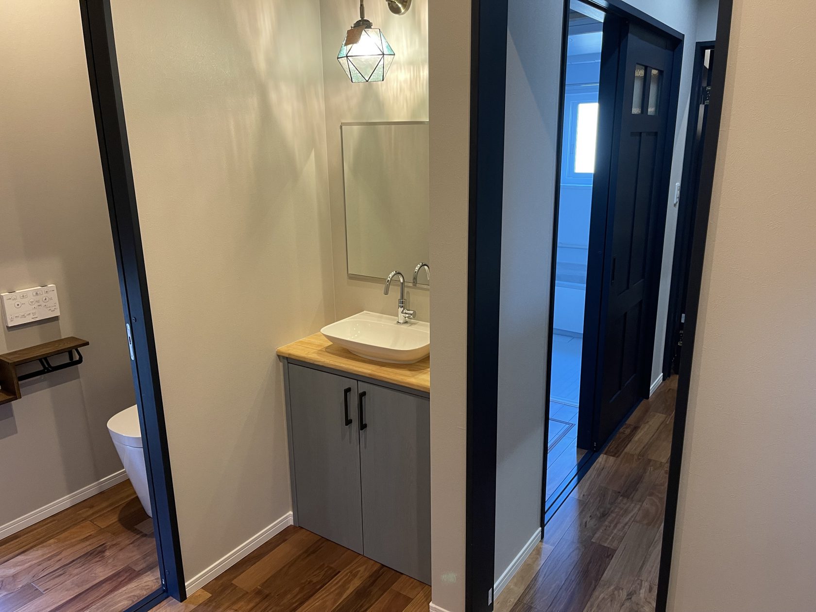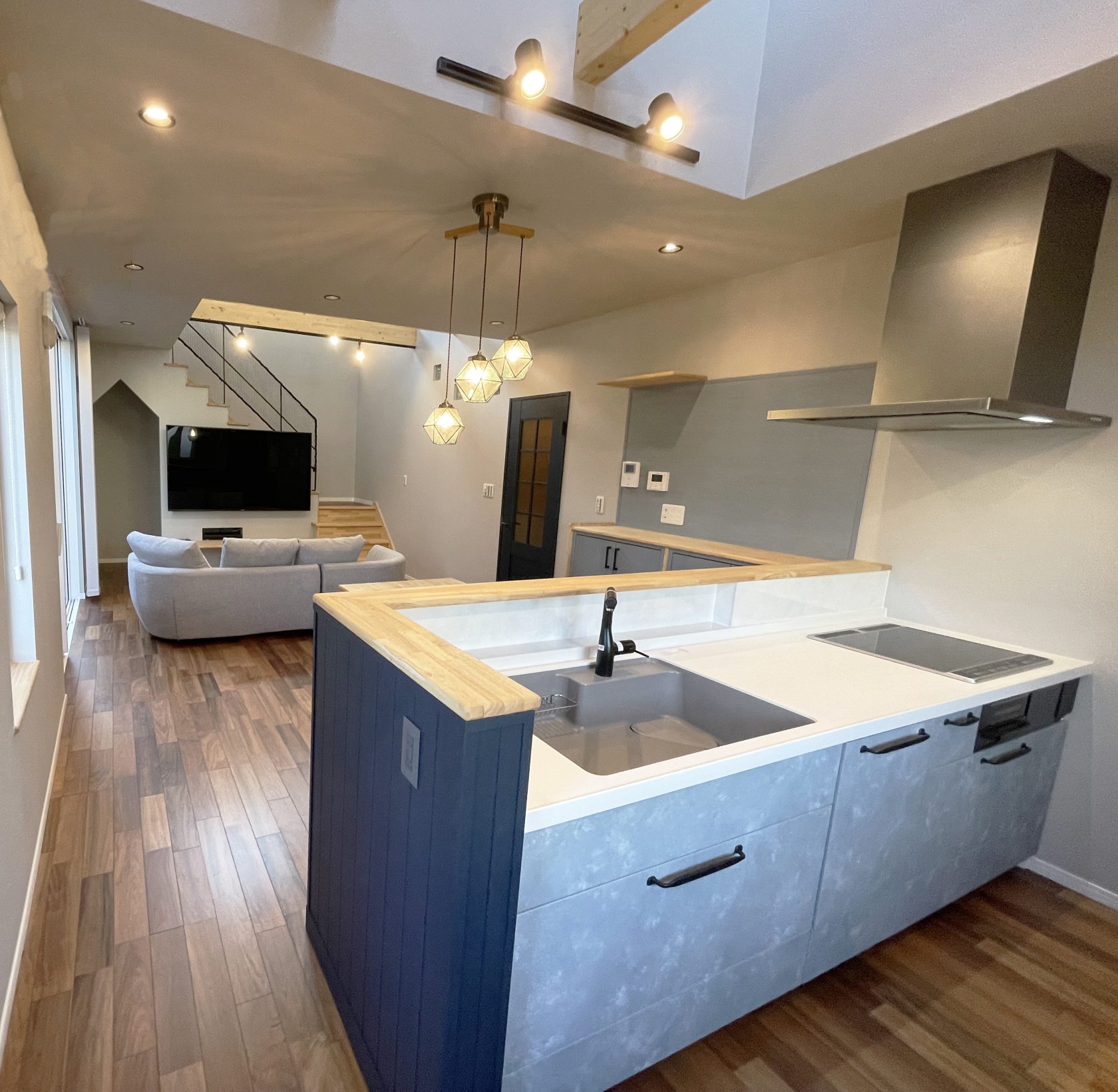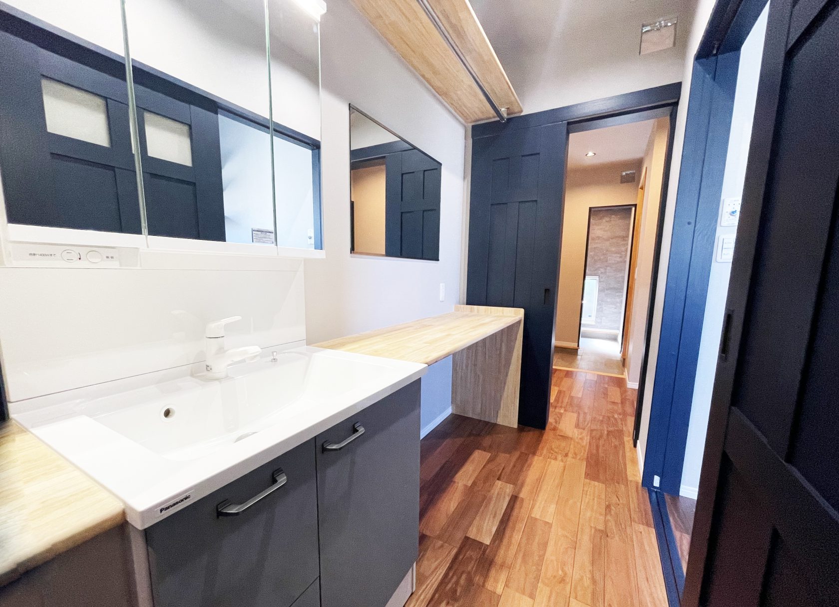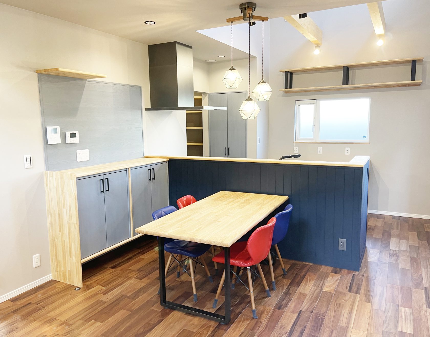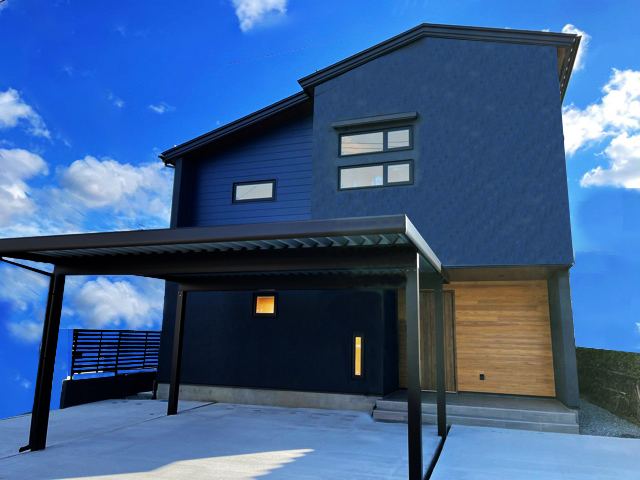 傾斜のきつい北東角地にRC擁壁を施工し隣地と同じ高さの宅地へ。古い上水管は交換し衛生面にも配慮。宅盤は盛土し傾斜地から整形地へ造成するところから始まった家づくり。外観はベースに左官塗壁のクールネイビー、アクセントには鋼板のクールネイビーと素材の違う同色を選択。雨の日でも濡れない広めのエントランスは無垢材を使用し色のトーンを上げることで明るさを持たせました。内部の建具もクールネイビーで統一し硬くなりすぎない様に収納建具にはブルーグレーで柔らかい雰囲気の演出。