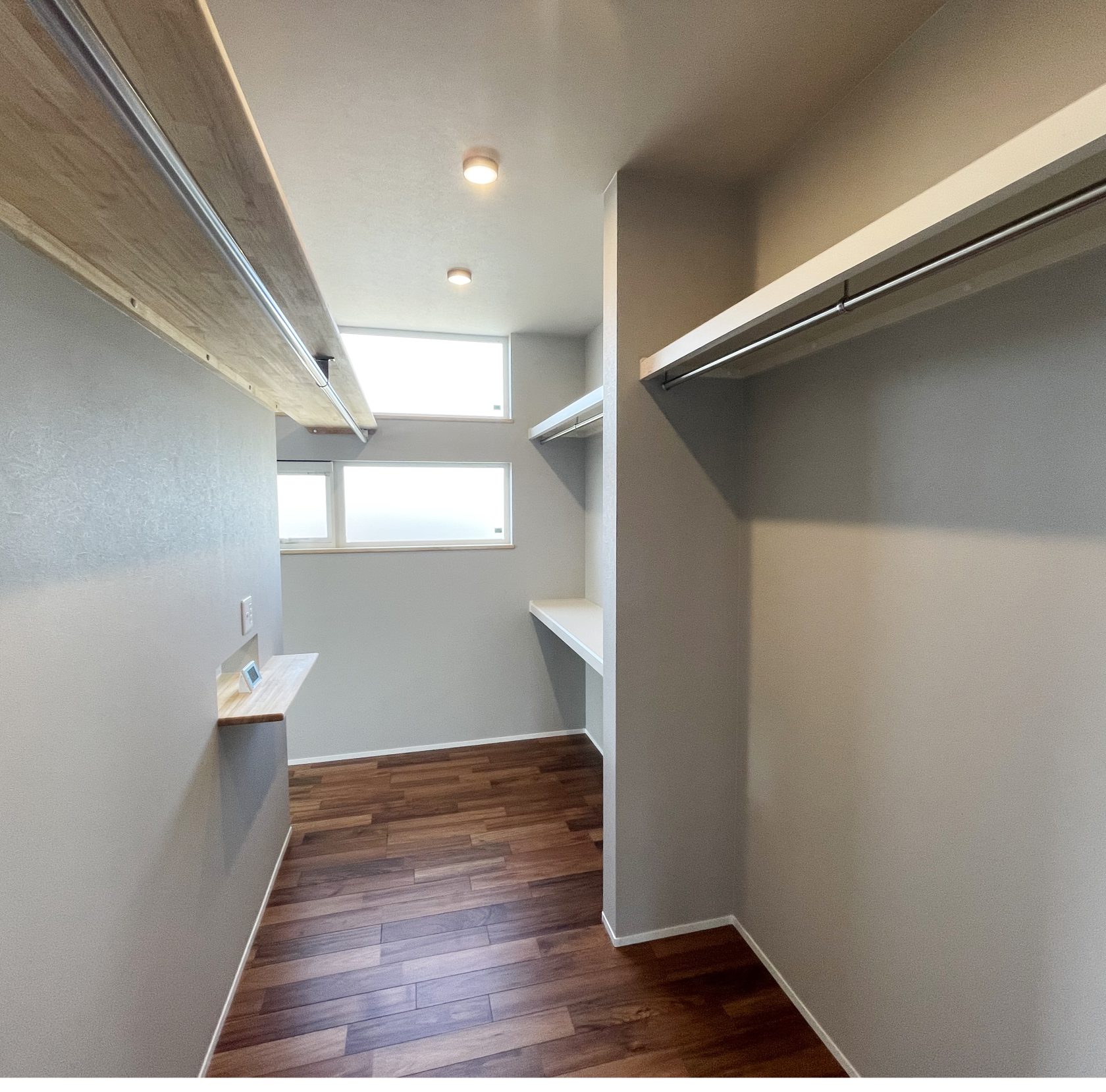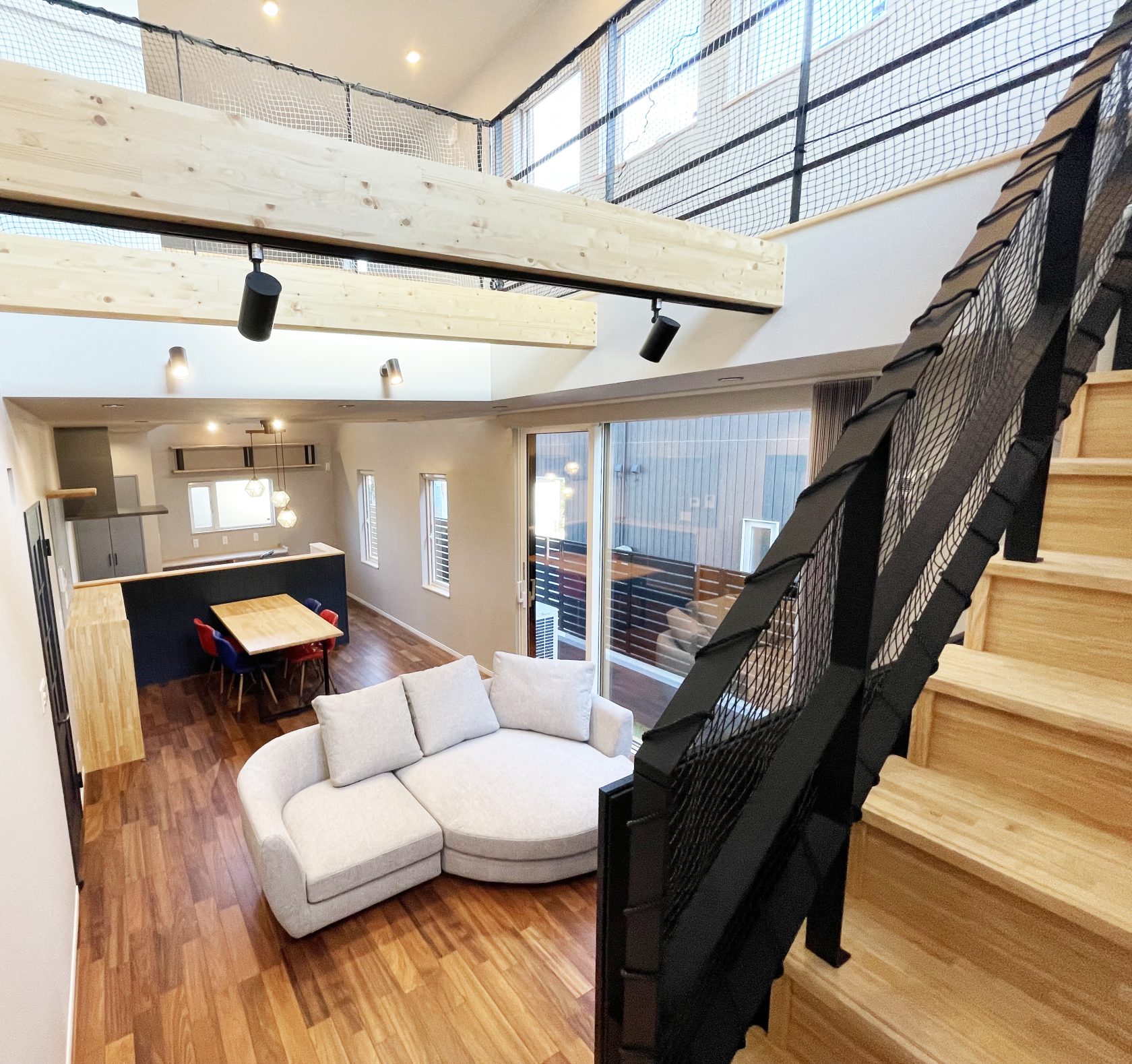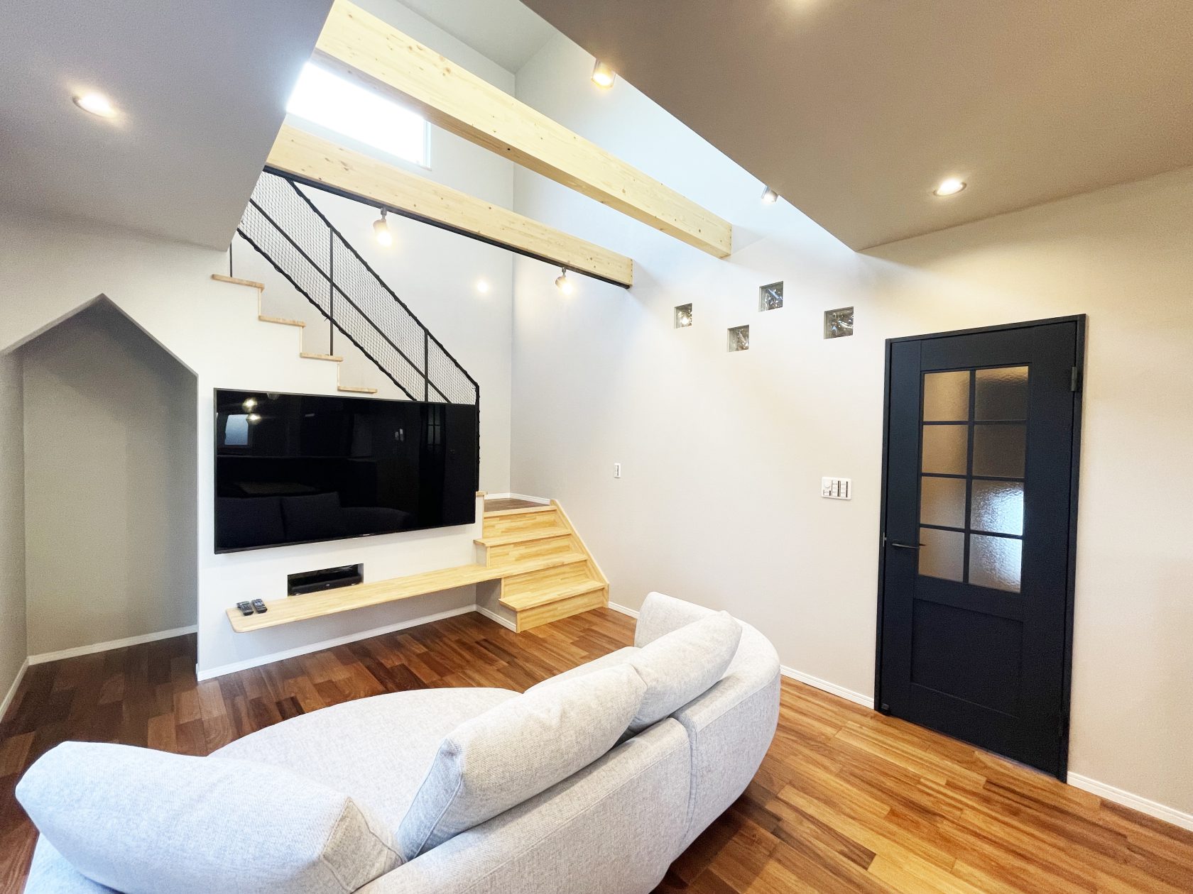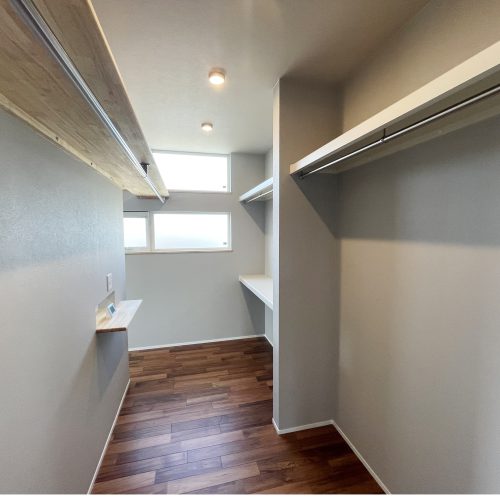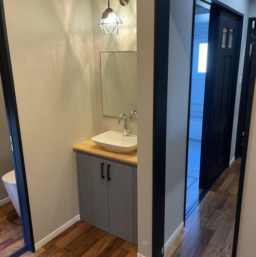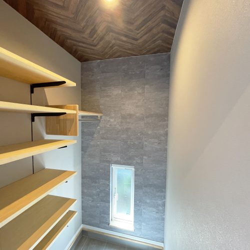 傾斜のきつい北東角地にRC擁壁を施工し隣地と同じ高さの宅地へ。古い上水管は交換し衛生面にも配慮。宅盤は盛土し傾斜地から整形地へ造成するところから始まった家づくり。外観はベースに左官塗壁のクールネイビー、アクセントには鋼板のクールネイビーと素材の違う同色を選択。雨の日でも濡れない広めのエントランスは無垢材を使用し色のトーンを上げることで明るさを持たせました。内部の建具もクールネイビーで統一し硬くなりすぎない様に収納建具にはブルーグレーで柔らかい雰囲気の演出。