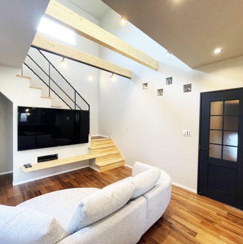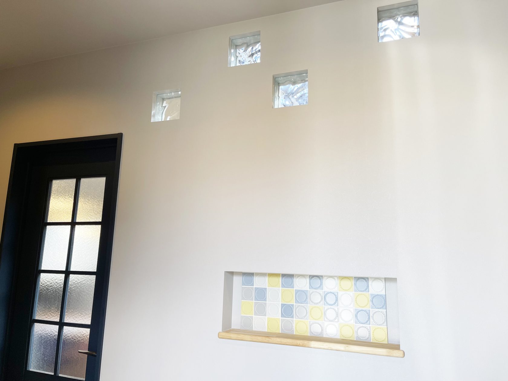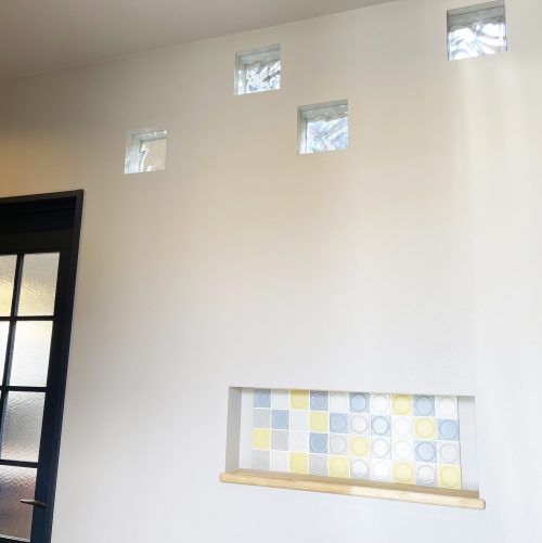 可愛さ溢れるタンバリンタイルは約6cm四方の小さなタイルを色違いにランダムに組み合わせました。玄関入ってすぐに視線が向いてしまうタイル×ガラスブロックは、外観とは違う可愛い印象に。家に出入りする度、またお客様を和ませてくれるアイテム。