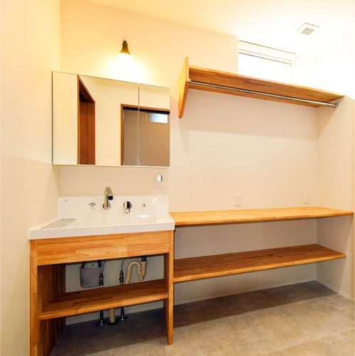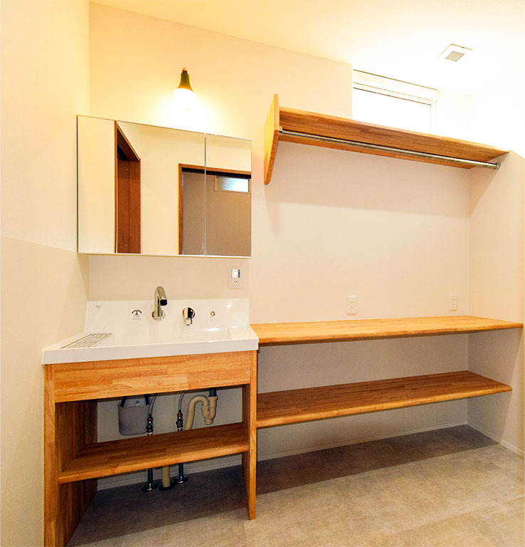 収納付洗面鏡(サンワカンパニー)×洗面台上部(某メーカー品)×造作カウンター。 既製品だけでは叶えられない使い勝手を実現。空間全体が同じテイストになるように樹種は統一。
