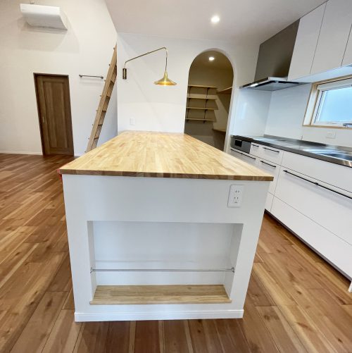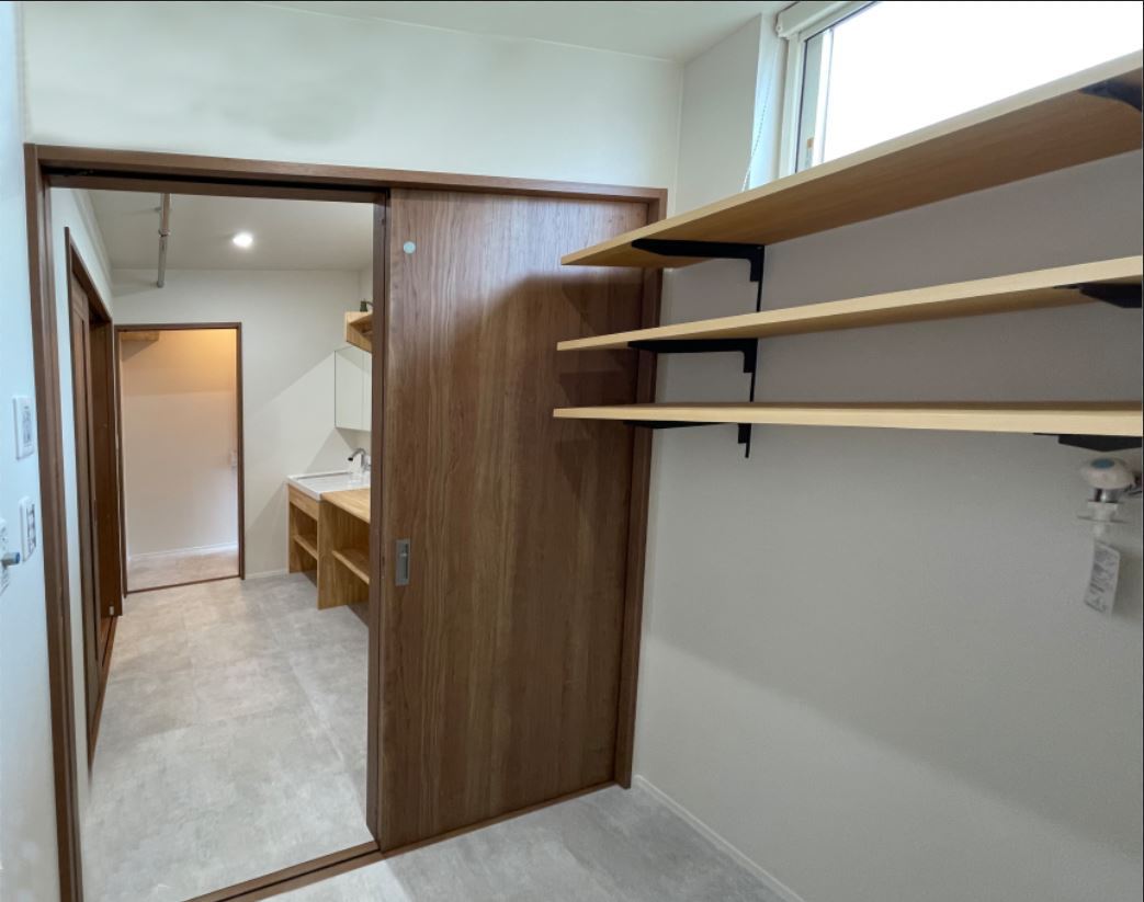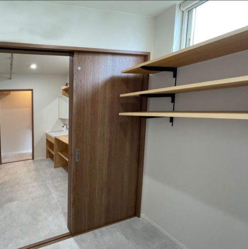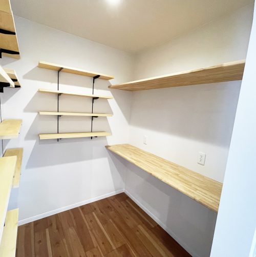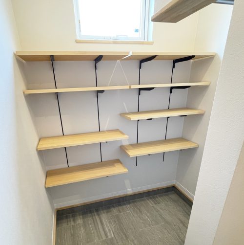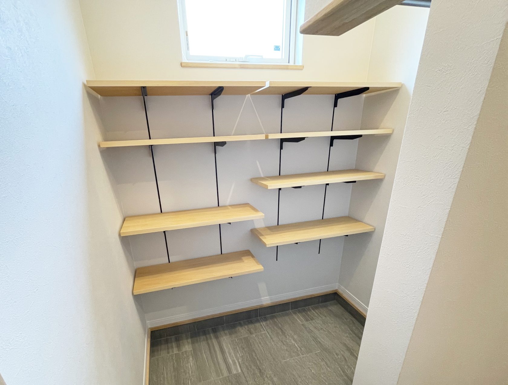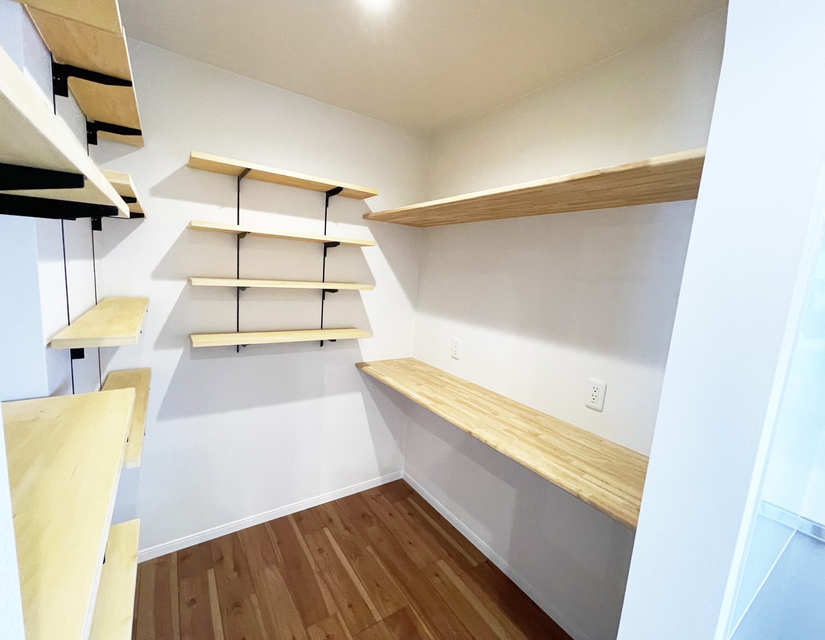 食品だけでなく家電も収納するパントリー。丈夫な固定棚と可動棚を設け、用途に合わせて使い分けが可能。リビングからは見えないクローズタイプのパントリーは散らかっても大丈夫。