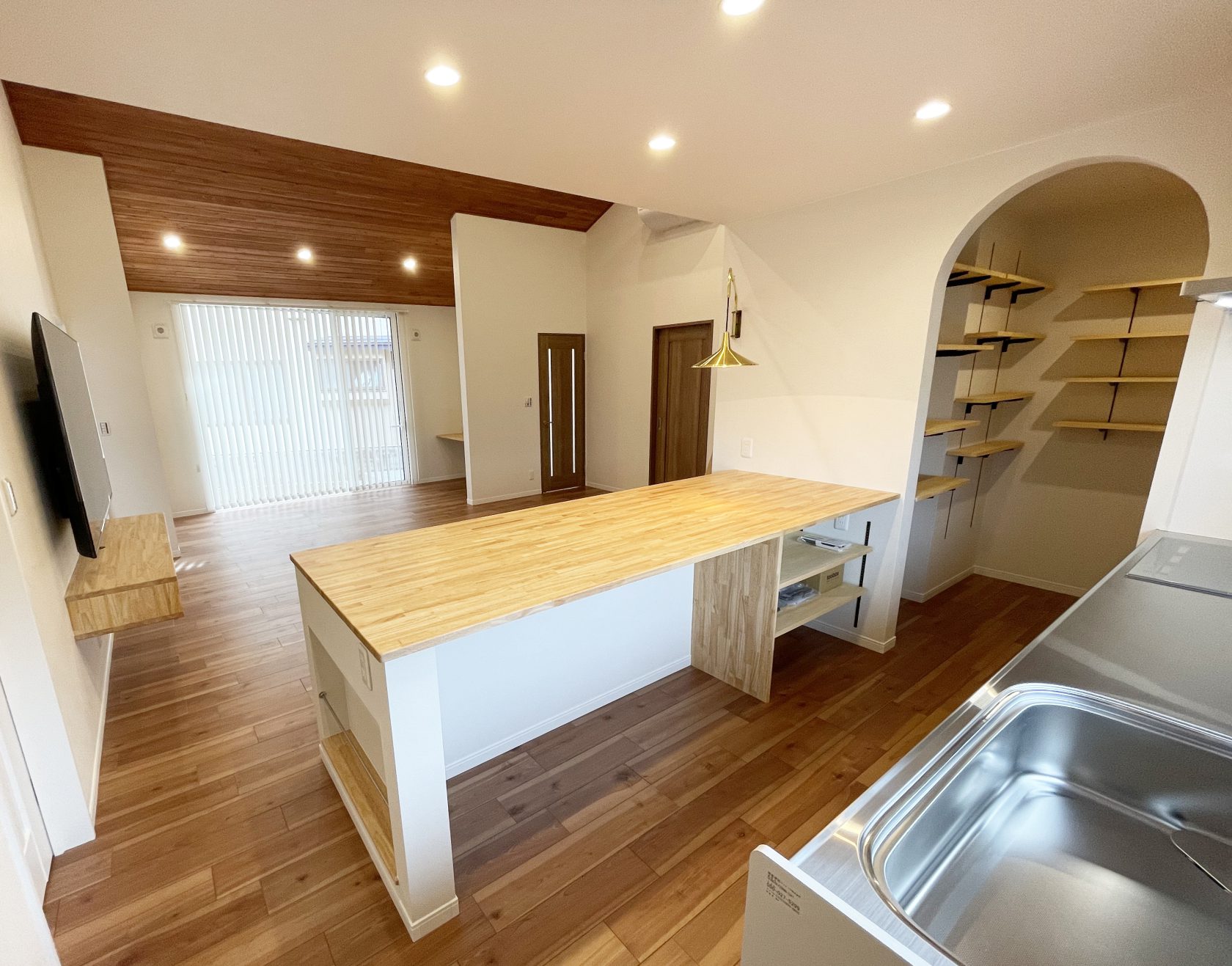 浮造り仕上げの勾配天井は、リビング全体を暖かい空間に。オーダーメイドのTVボードは壁付けのフロートタイプ。無垢材の仕上げは全体の40%程とし、癒しの空間へ調整。