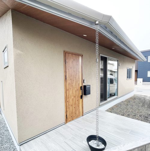 2階建てから理想の平屋へ建替え工事。張り間方向、けた行き方向に、バランスよく耐力壁を設け、筋交いとパネルを釣合い良く配置した軸組み工法。切妻屋根の躯体は、断熱+通気+遮音を強化し冬は暖かく夏は涼し仕様。天然石を入れた左官仕上げのシンプルな塗り壁は、高耐久ベース外壁。不整形地に目一杯、建物を配置し三角に張り出した軒先は雨の日でも濡れずに出入りできるように配慮。リビングを中心に動線を簡略化し、プライベート空間も確保した家族みんなが将来も生活しやすい間取りを設計。