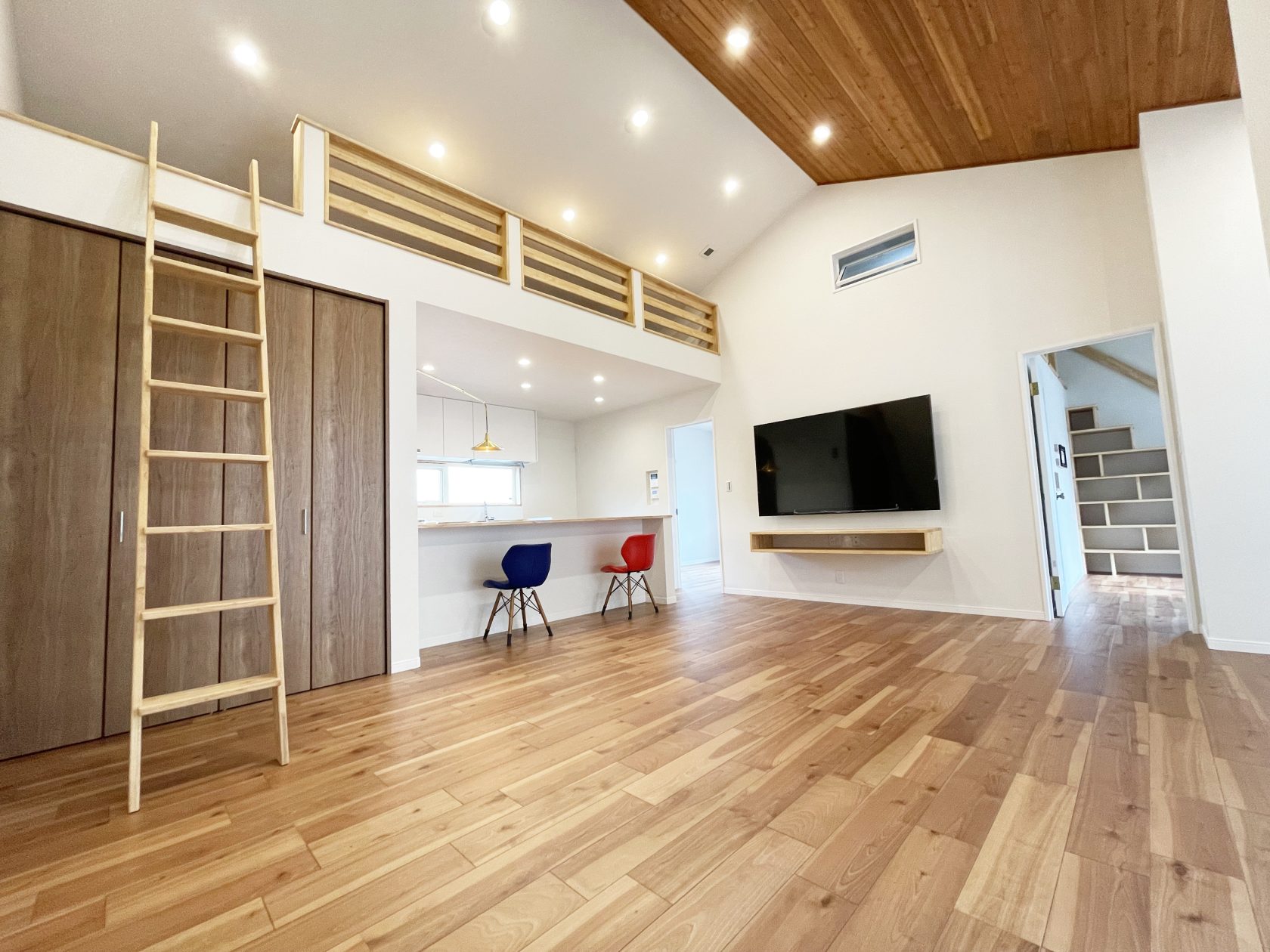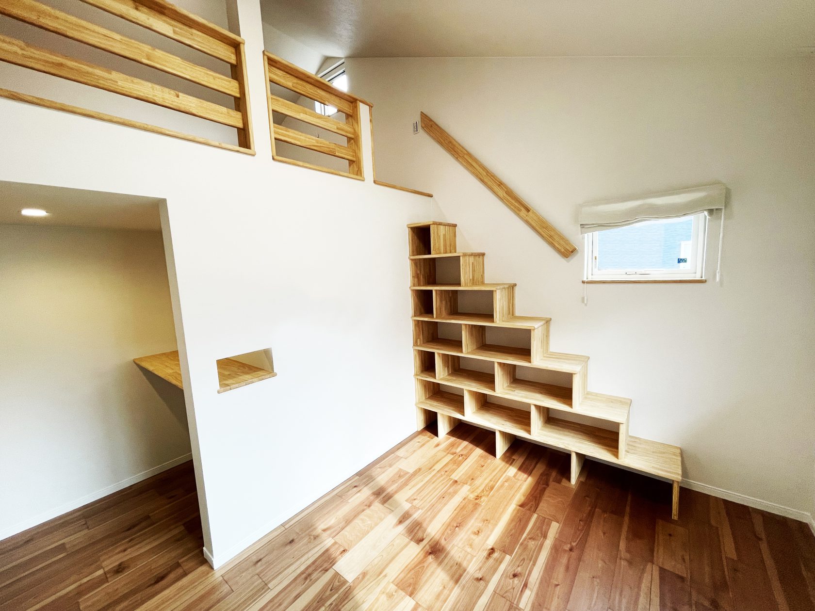 洋室はスペースを有効活用する為、本や服など収納が可能な階段。壁掛けTVにデッキも壁の中へ収納するスペースを確保。