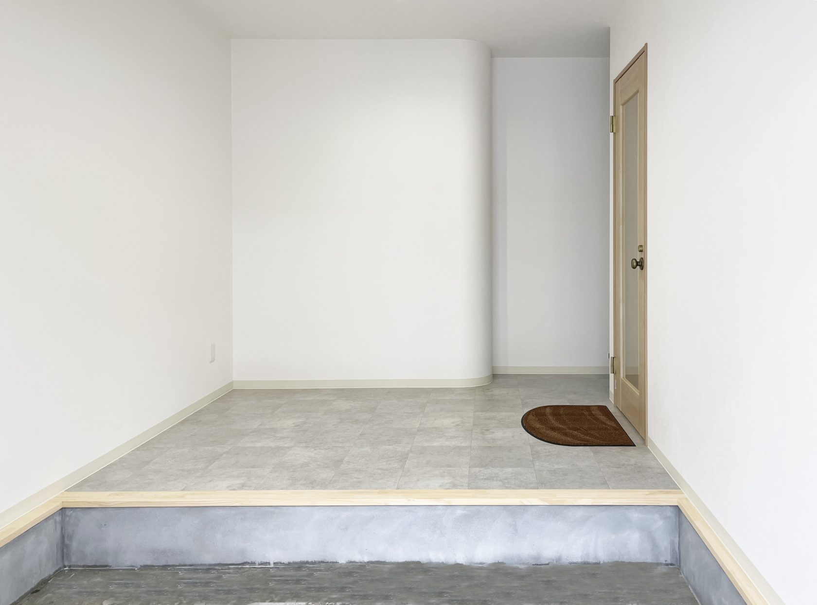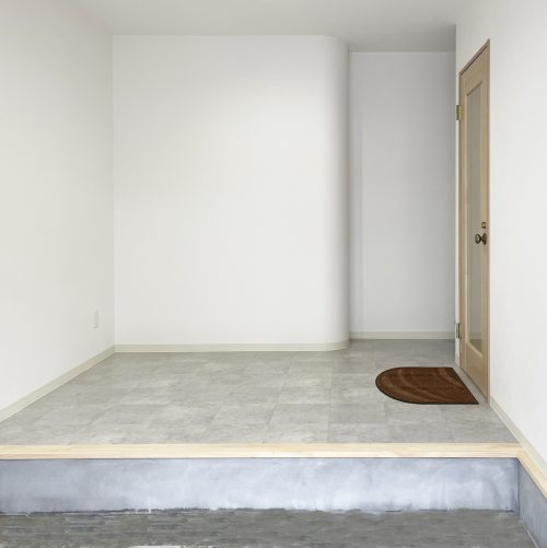 リフォーム前の古風なイメージを感じさせる幅広エントランスを高強度モルタルで仕上げ、全体をナチュラルテイストに。