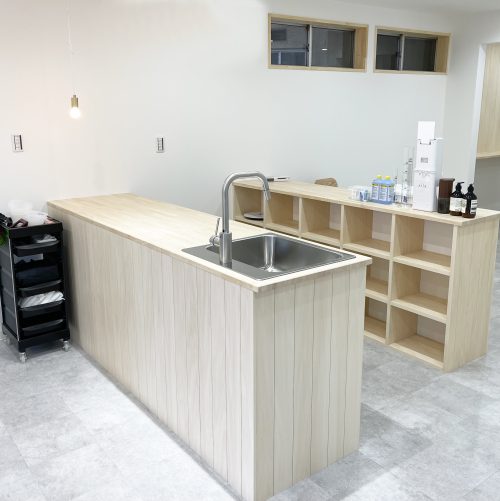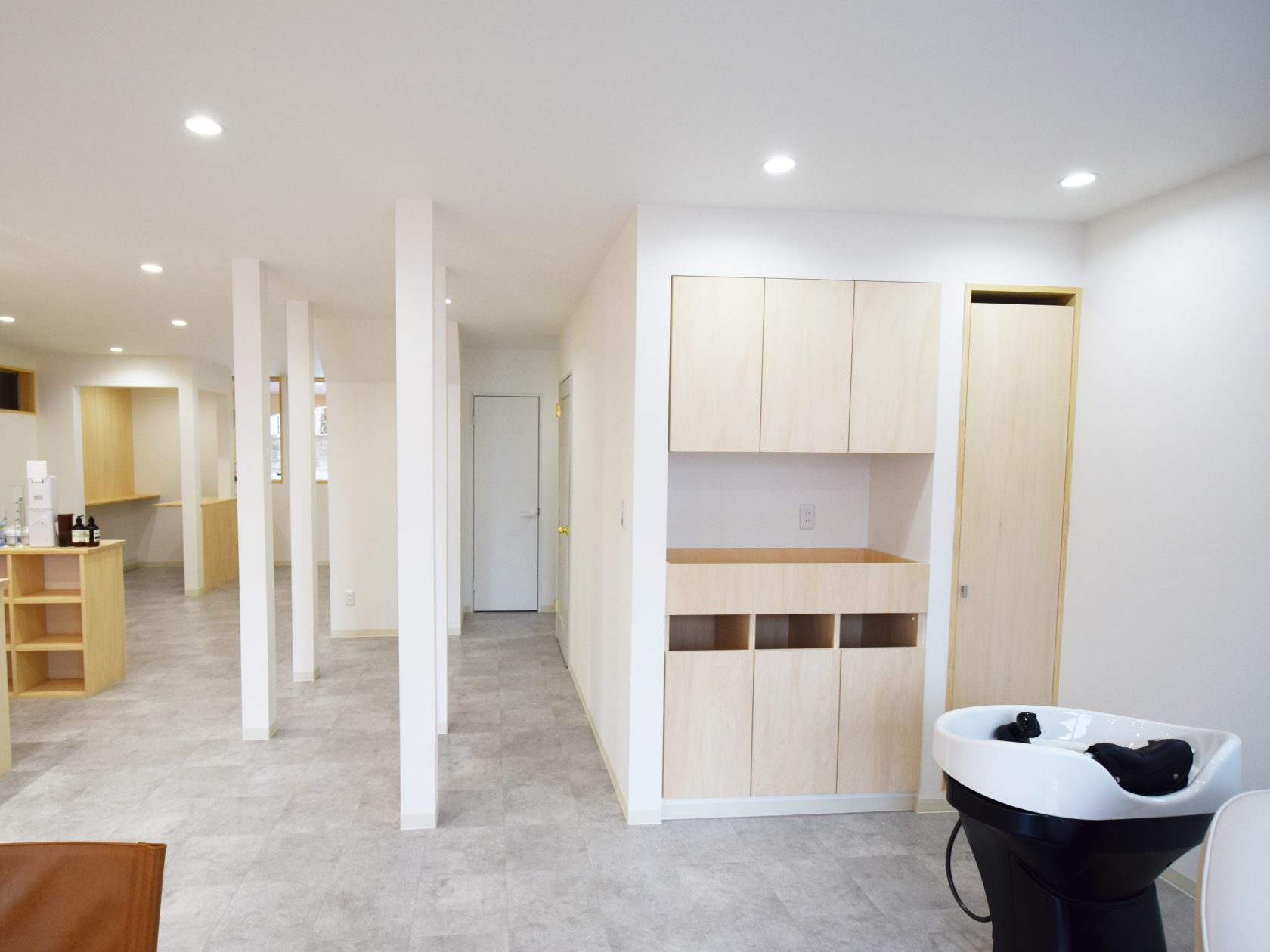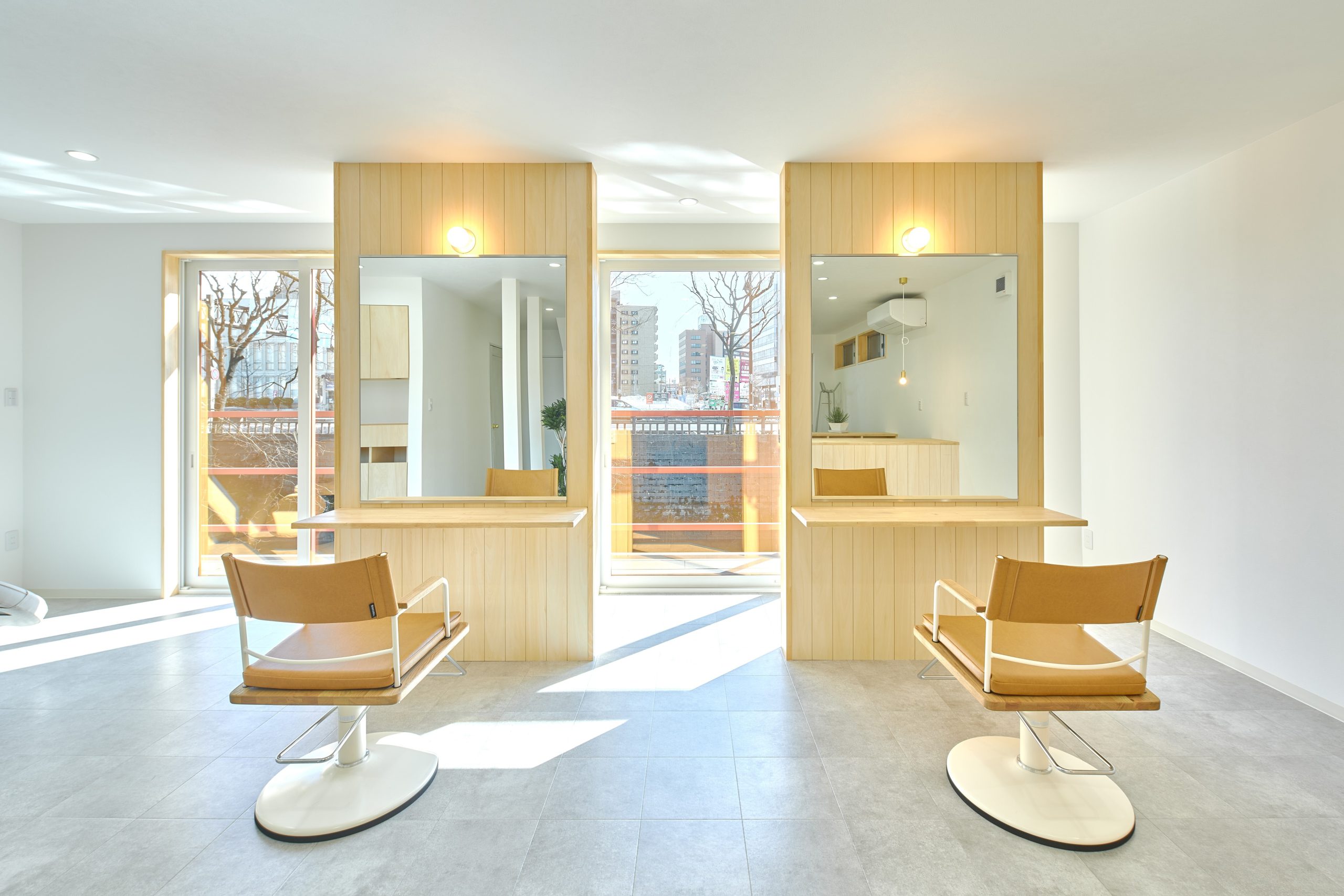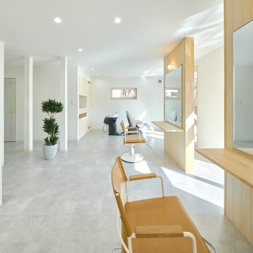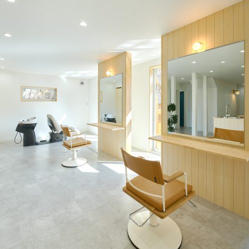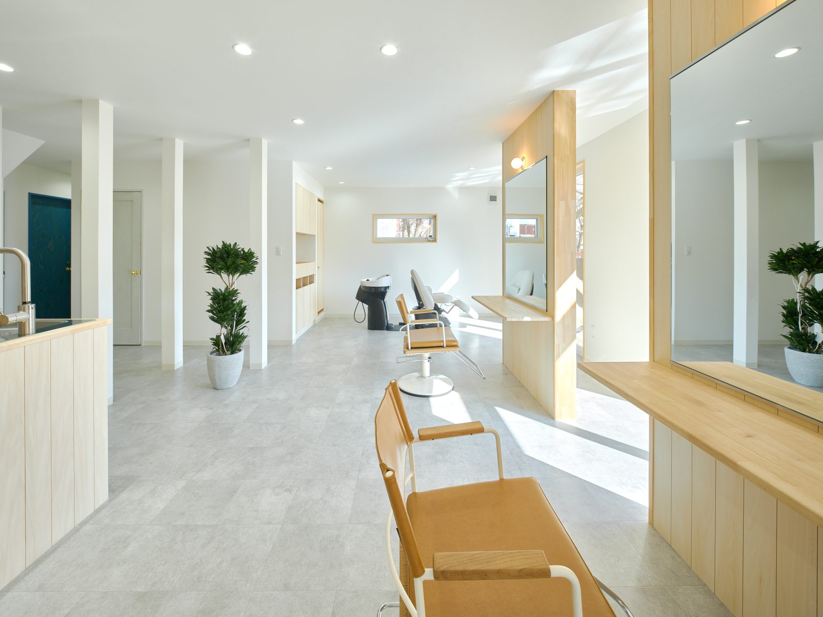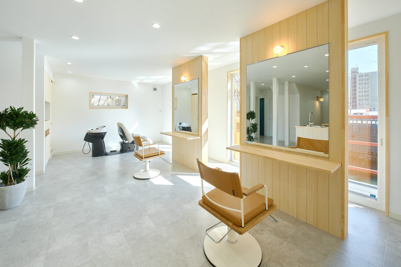 追加した耐力壁を利用しカット台の設え。裏の大きなピクチャーウインドウにはウットデッキの先に動く街絵。