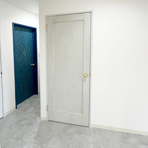 イギリスの古い家屋で使われていたアンティークドア。オーダーで製作したビビットブルーのドア。ドア寸法を揃え同じ把手にすることでバランスを調整。