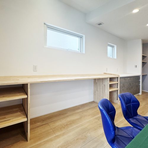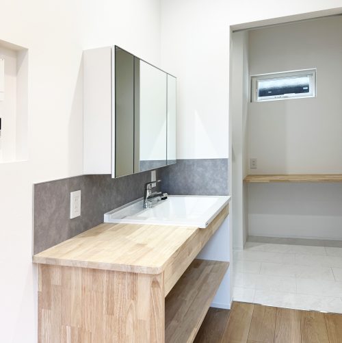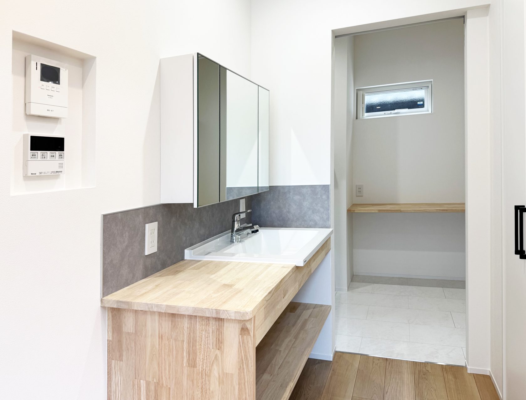 作業スペースが広く化粧等の動作をアシスト。背面には収納を備え拡張性ある空間へ。