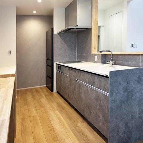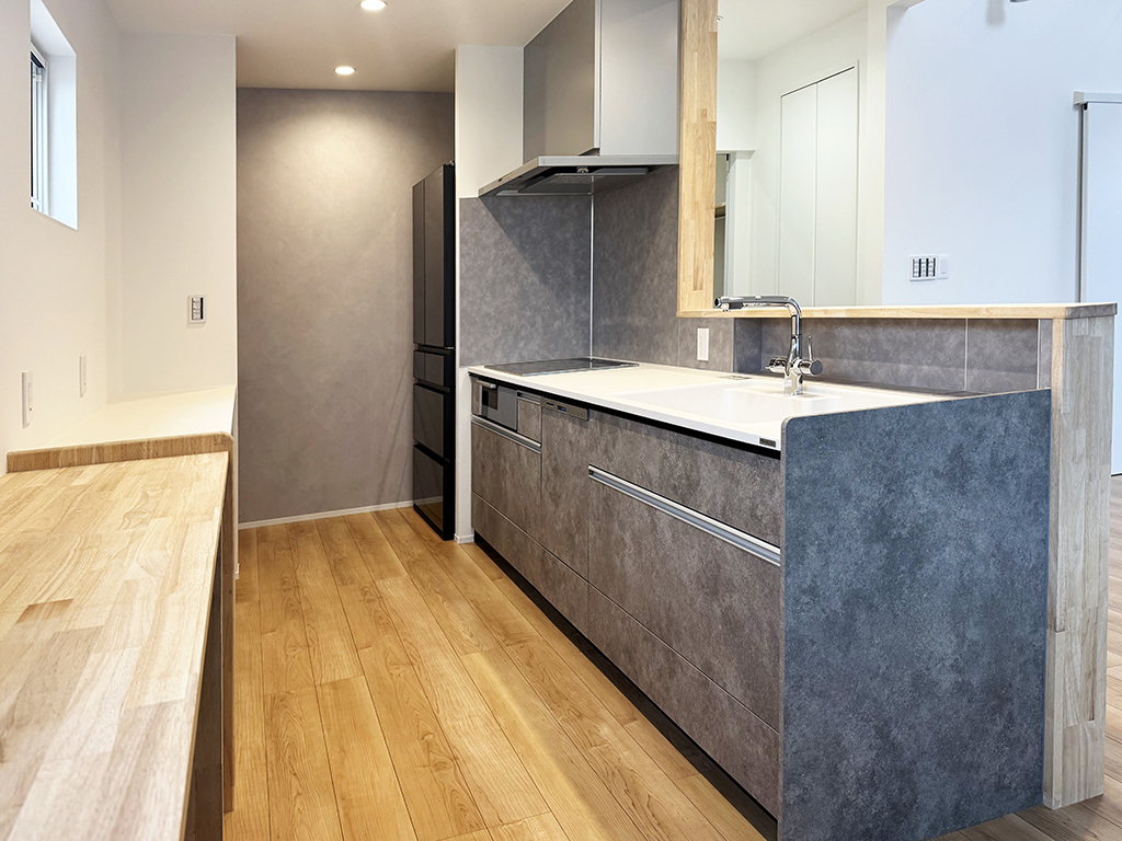 キッチン周りの無機質素材に対し棚や床は有機質な木目調で構成。