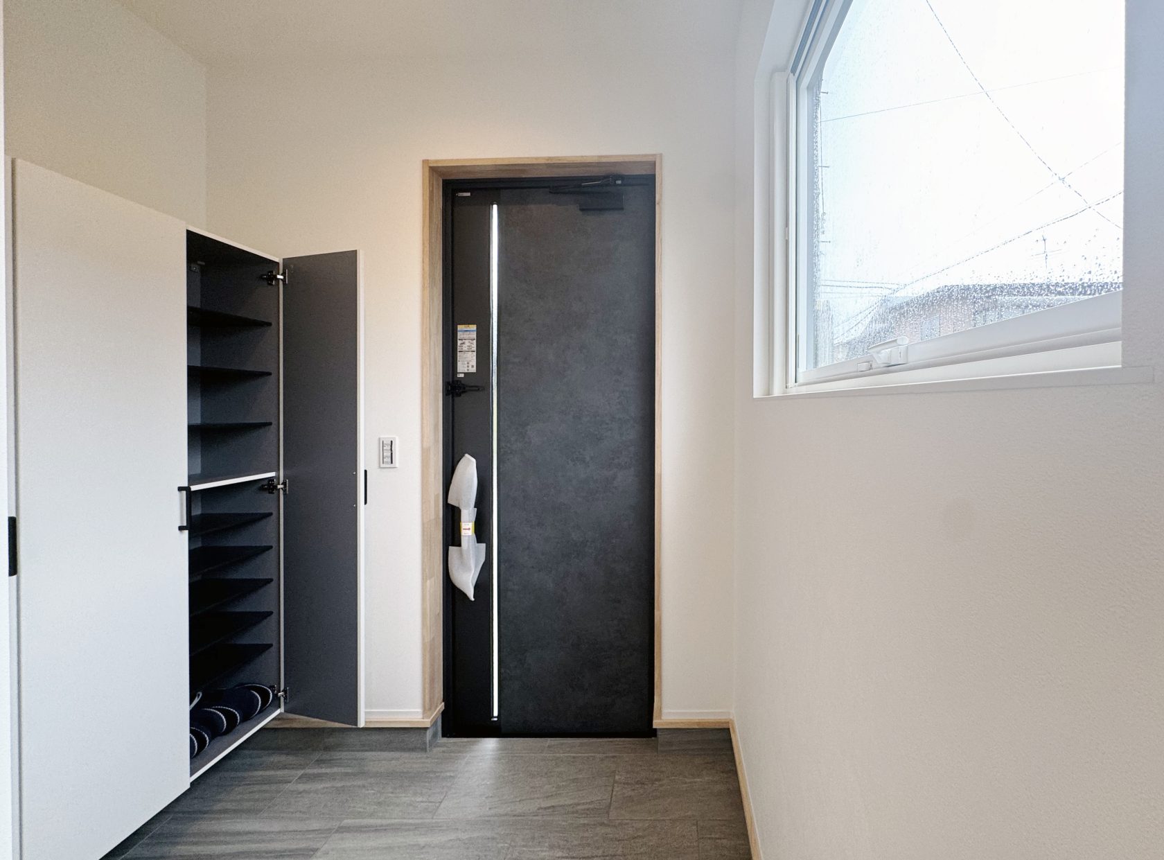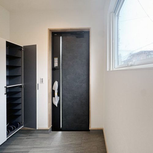 柔らかな自然光を主役にシンプルにまとめた玄関は96足の靴を収納できる実用的な空間。