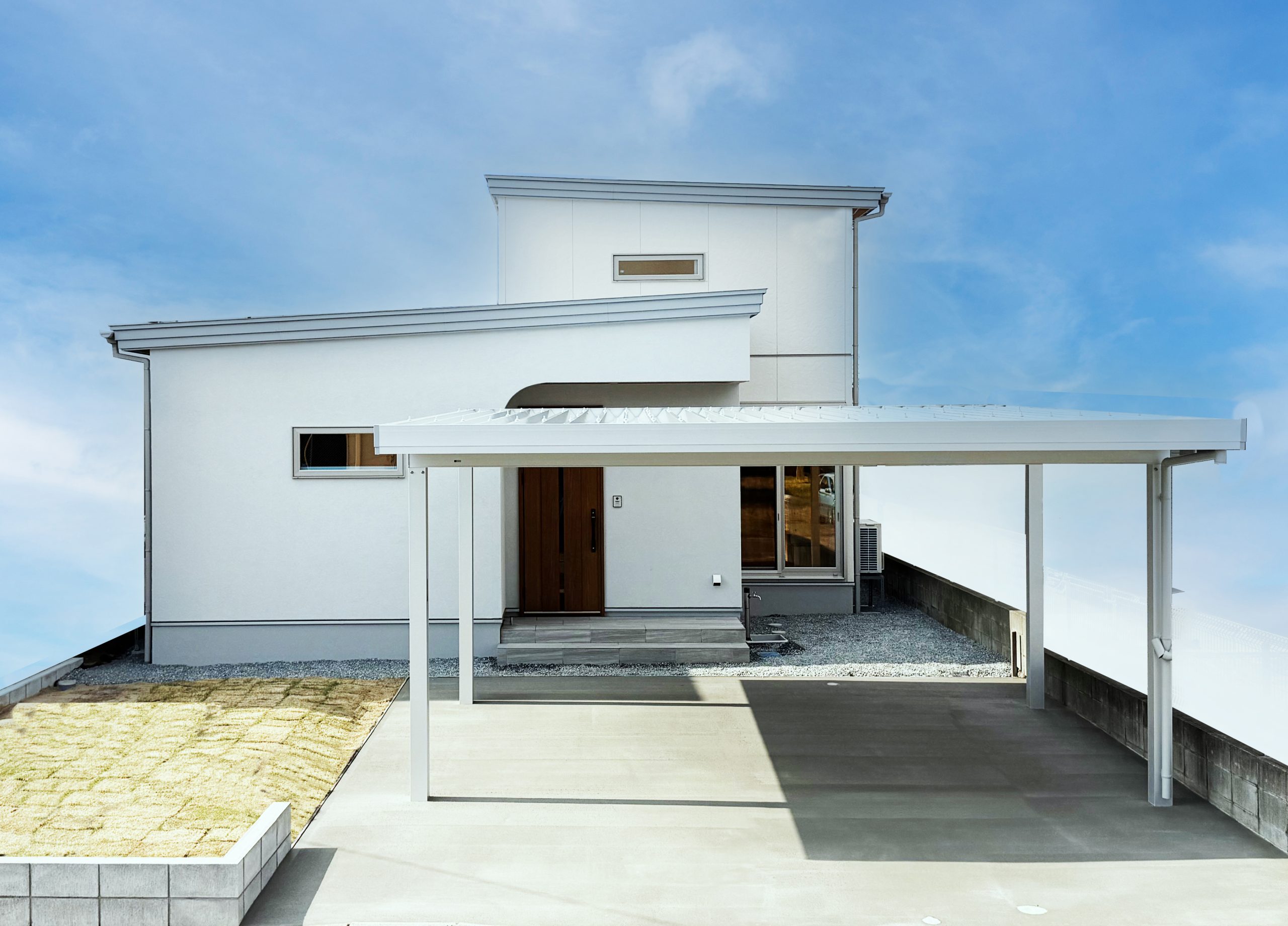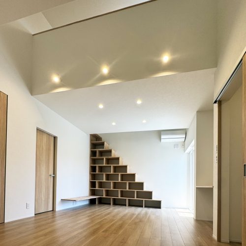棚と階段が融合したデザインが個性を放つリビング。くつろぎの中に、ほんの少しの“楽しい”を添えて。