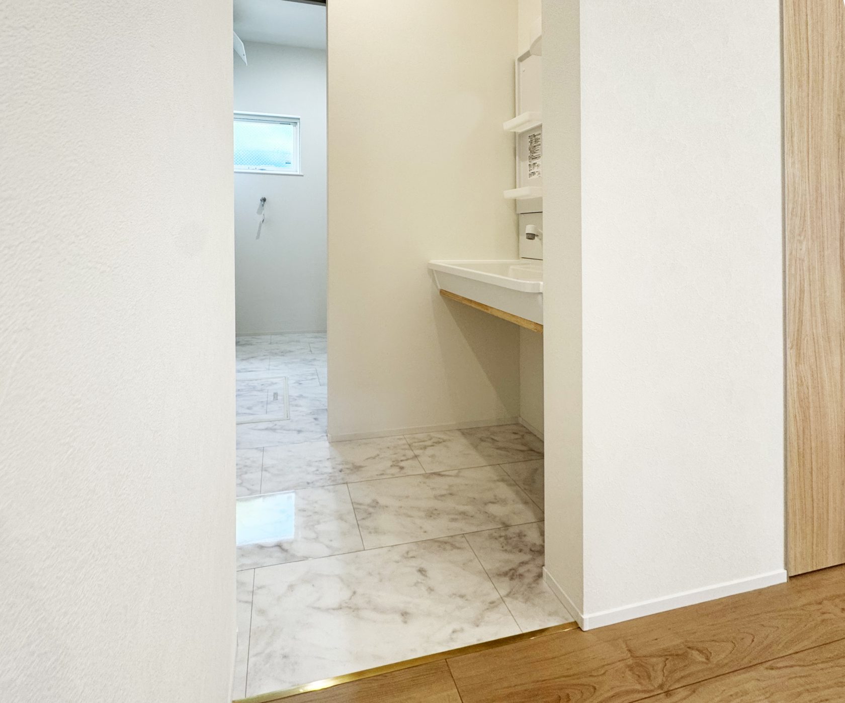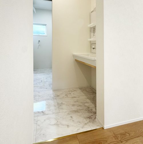 白を基調とした明るい空間に大理石調の床材を採用。清潔で上品な雰囲気の中、毎日の身支度も快適。